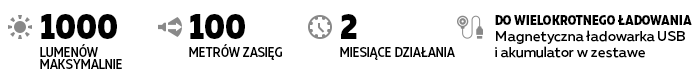 Strumień świetlny do 1000 lumenów i zasięg światła do 100 metrów: jasność lampy jest tylko nieznacznie gorsza od charakterystyk większych modeli. Główną różnicą jest żywotność baterii - imponujące w stosunku do swojego rozmiaru miesiące na jednej baterii. Specjalna technologia umożliwia ładowanie dowolnych akumulatorów litowo-jonowych 18350 wewnątrz latarki. Do ładowania służy magnetyczny kabel USB.
