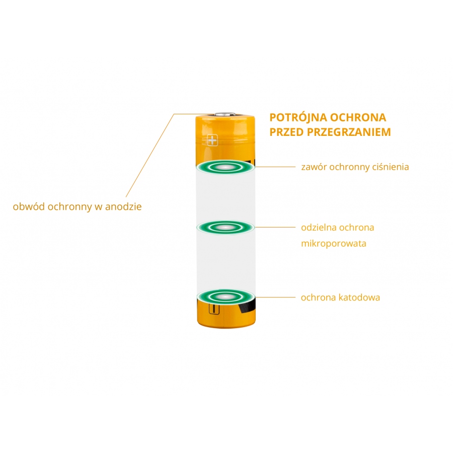 Producent zastosował wielopoziomowy system zabezpieczeń, który w maksymalnym stopniu wydłuża żywotność i zapewnia najwyższy poziom bezpieczeństwa akumulatora.