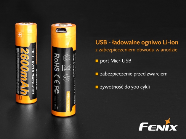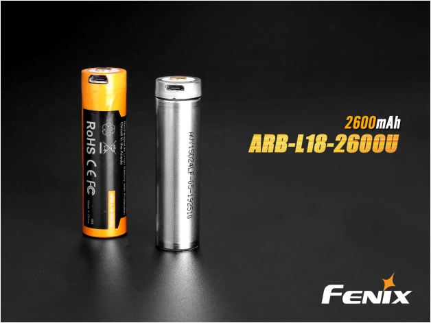 Innowacja Fenix'a! Najnowszy akumulator z możliwością ładowania poprzez port Micro USB. Możne je również ładować tradycyjną ładowarką. ARB-L18U ma pojemność 2600 mAh. Jak każde inne ogniwo 18650 Fenix'a można je stosować w latarkach ręcznych, czołowych, kempingowych i rowerowych. Zastosowano tu także szereg zabezpieczeń, które wykorzystywane są w dotychczasowych akumulatorach.
