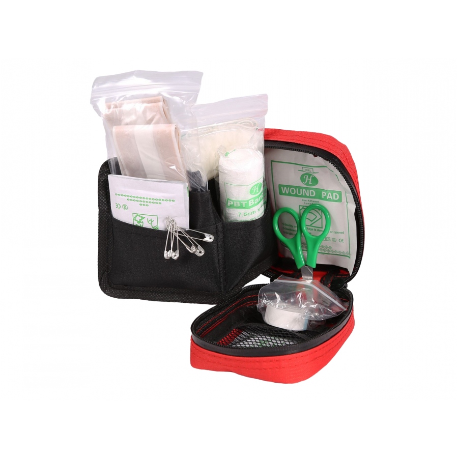 Sytem przegród i 4 wewnętrznych kieszeni pomaga w wygodnej organizacji medykamentów. Na zewnętrznej ściance naniesiono oznaczenie z białym krzyżem.