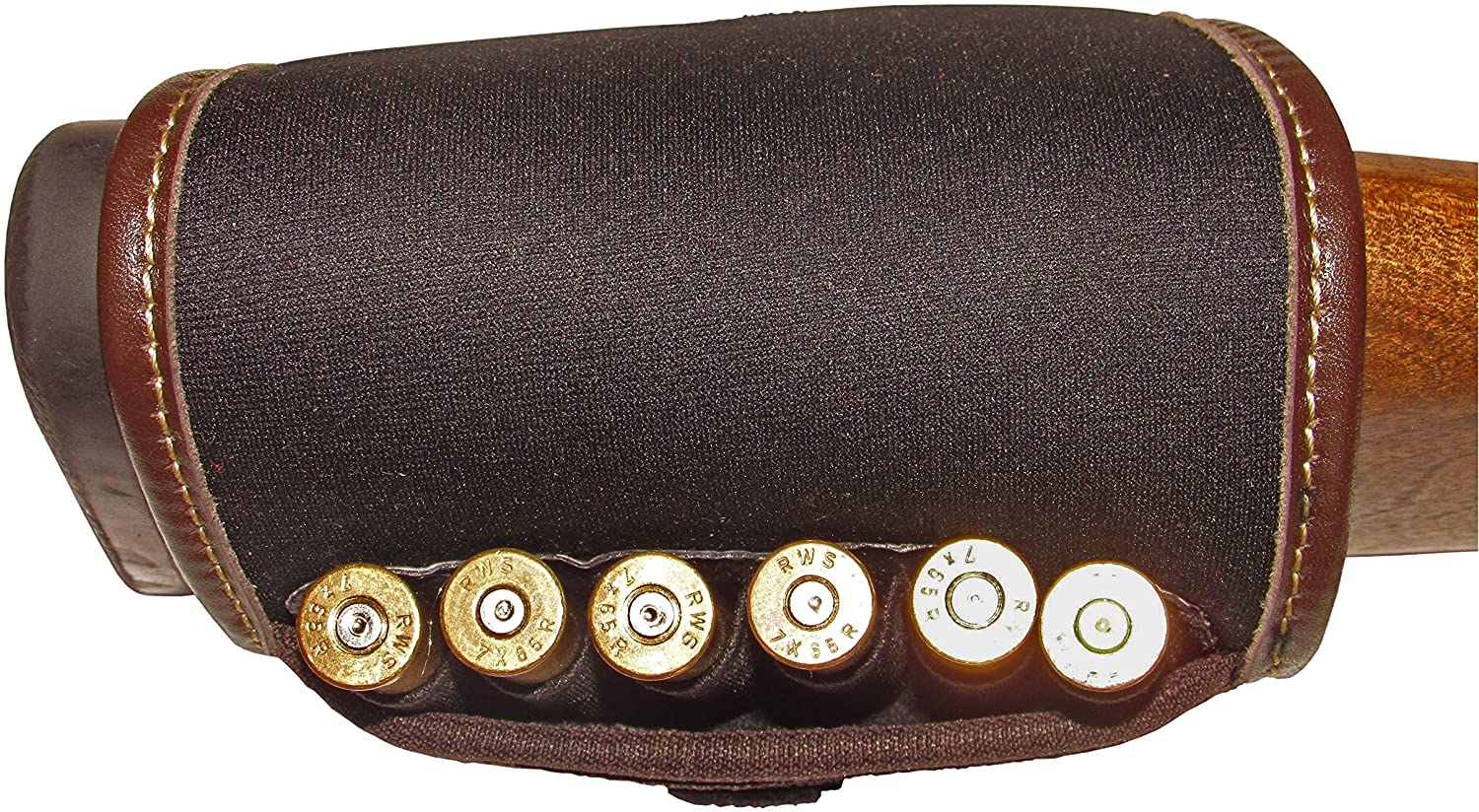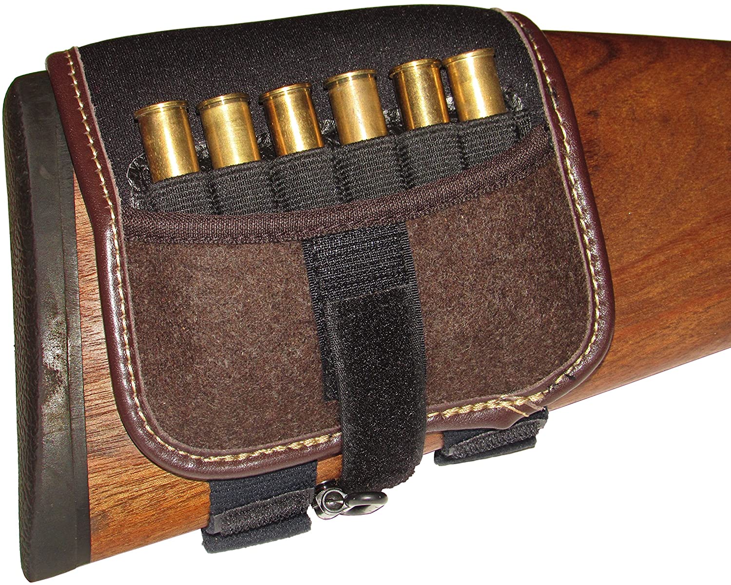 Praktyczne etui na amunicję kulową (na 6 sztuk) wykonane z Lodenu i obszyte skórą. Mocowanie na kolbie za pomocą rzepów. Pokrywka posiada przedłużany pasek-rzep, który obejmuje kolbę od spodu i pokrywka staje się wygodną, miękką baką.