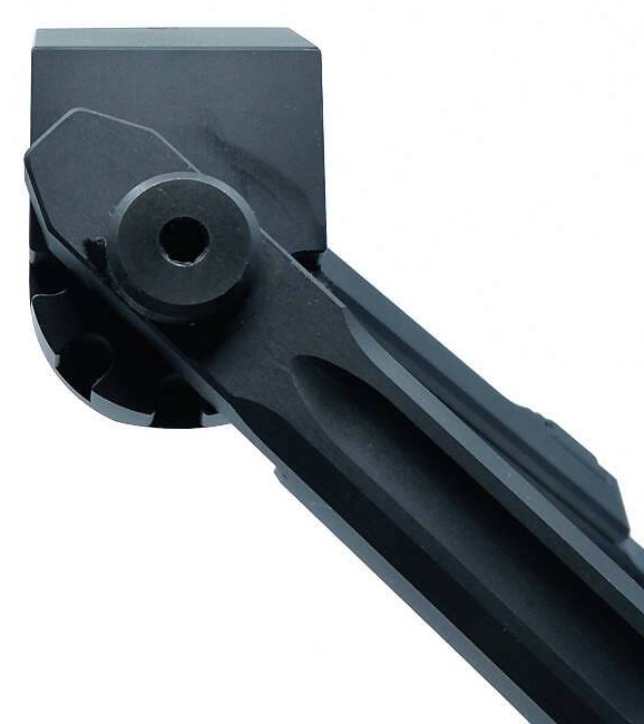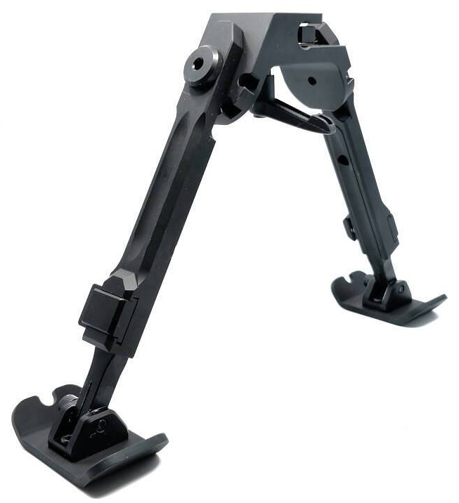 Bipod mocowany do trzpienia równoległego do lufy, znajdującego się pod nią. Solidnie wykonany, sztywny i stabilny. Składany do przodu. Posiada regulację wysokości w zakresie: 184mm - 235mm (mierząc do górnej krawędzi bipodu, która w przypadku zastosowania adaptera na Picatinny Fortmeier odpowiada dolnej krawędzi szyny Picatinny). Bipod pozwala na nieznaczne uchylanie na boki (w osi równoległej do lufy) z blokadą.
