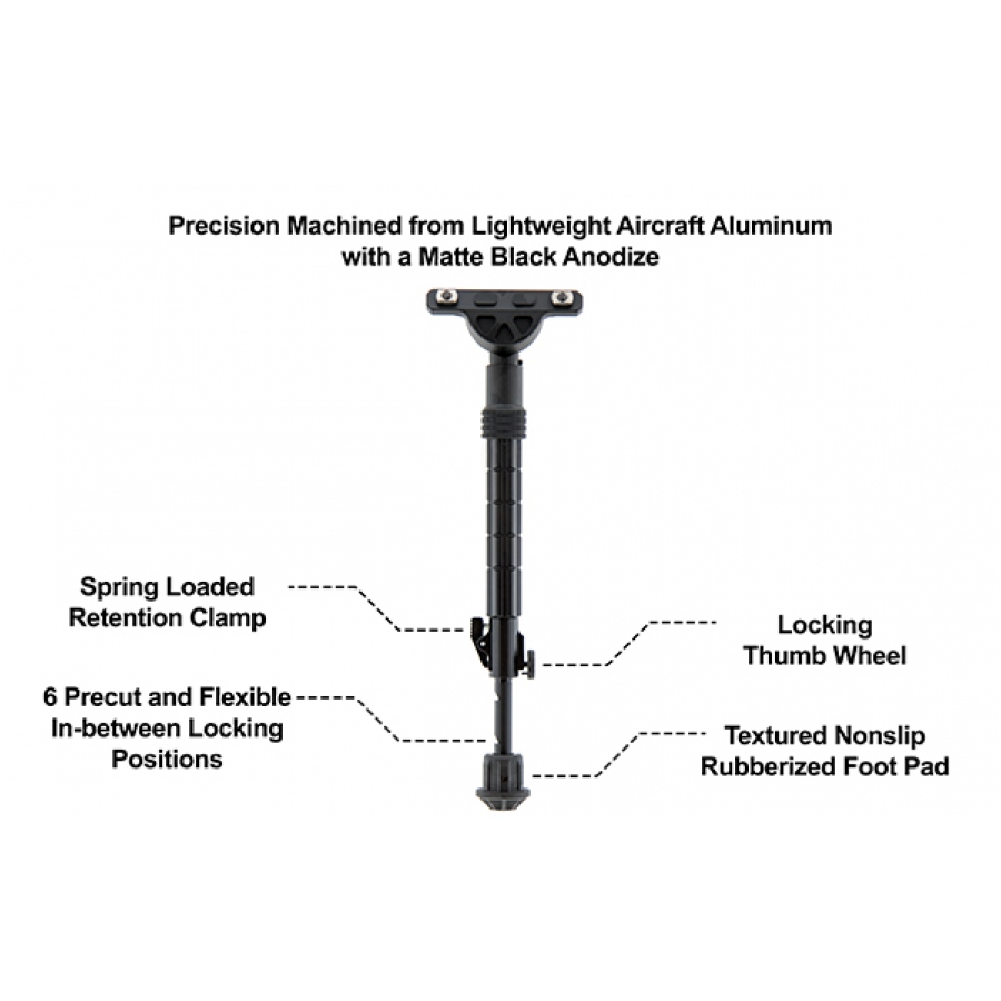 Dwójnóg wykonano z lekkiego, wytrzymałego aluminium lotniczego o matowym wykończeniu. Bipod mocowany jest po obu stronach chwytu w pozycji godzinowej 3 i 9. Dwójnóg posiada wygodną i szybką w użyciu blokadę pozycji, w postaci sprężynującego pierścienia.