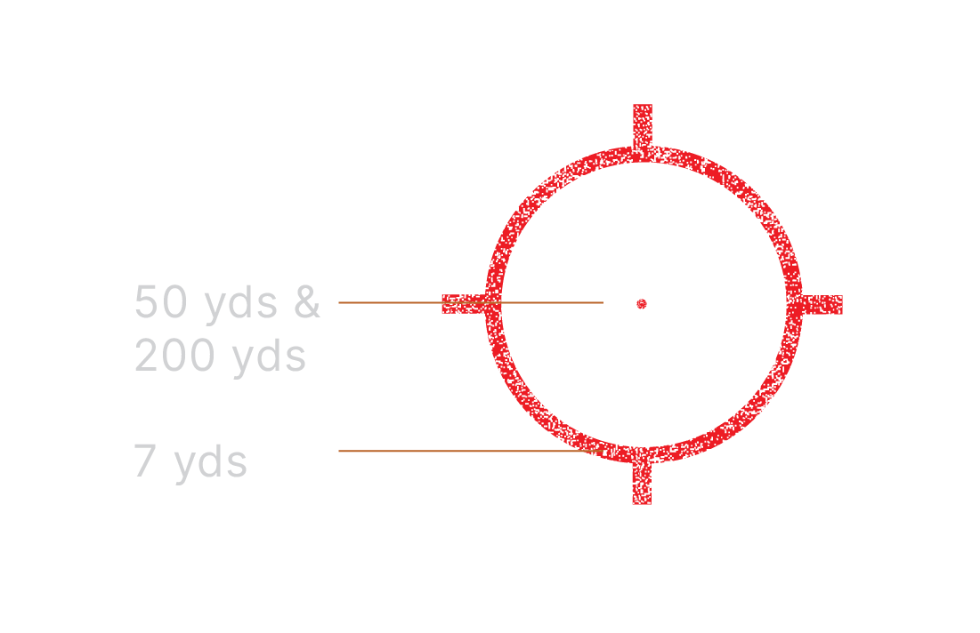 Punkt celowniczy został zaprojektowany do szybkiego namierzania celów, a zewnętrzny okrąg o średnicy 68 MOA ułatwia szybkie znalezienie punktu celowniczego. Centralny punkt o wielkości 1 MOA współpracuje doskonale z powiększaczami i celami na odległość, nie zasłaniając ich. Ten uniwersalny punkt umożliwia precyzyjne strzelanie na różne odległości, bez konieczności zmiany ustawień. Na przykład, ustawiając celownik na odległość około 50 metrów, punkt trafienia będzie również trafny na 200 metrów, a dolna krawędź koła celowniczego wskazuje punkt trafienia na odległość około 6,5 metra.
