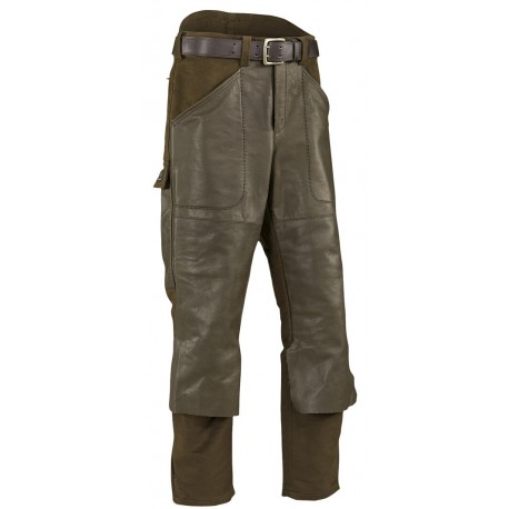 Spodnie z moleskiny ( 100% bawełny ) przody nogawek oraz siedzenie zabezpieczone obszyciami z koziej skóry. Luzne końce obszycia tworzą klapy zabezpieczające przed wodą.