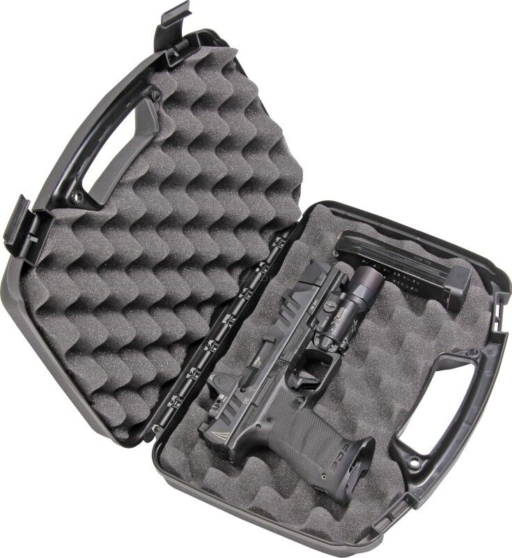 Futerał oferuje trwałą konstrukcję, stylowy wygląd, niezawodne zatrzaski i dużą wygodną rączkę. Wykonany z wytrzymałego polipropylenu z wykończeniem odpornym na zarysowania. Gruba wyściółka z pianki i podwójne zakładki na kłódki zapewniają najwyższy poziom bezpieczeństwa. Wystarczająco gruby, aby zmieścić blokadę spustu podczas podróży. Kłódki nie są dołączone.