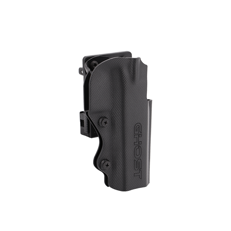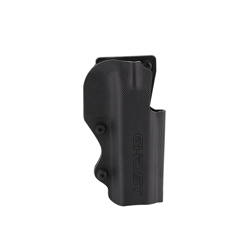 GHOST Civilian 3G to nowa wersja popularnej kabury z linii Conceal Carry, wyposażona w montaż z klipsem umożliwiającym szybkie zamocowanie i zdjęcie z pasa bez konieczności jego przewlekania. Dodatkowo klips posiada obrotową podstawę Dervet, co umożliwia dopasowanie kąta kabury do wygodnej pozycji strzelca. Kabura ta ma uniwersalne zastosowanie - świetnie sprawdza się podczas treningów strzeleckich, dynamicznych konkurencji strzeleckich oraz w codziennym przenoszeniu broni. Wykonana z wytrzymałego polimeru technicznego, kabura jest formowana termicznie w zależności od modelu pistoletu. Broń jest mocowana "na wcisk", a do regulacji siły wyciągania z kabury służą dwie śruby umieszczone w dolnej części.