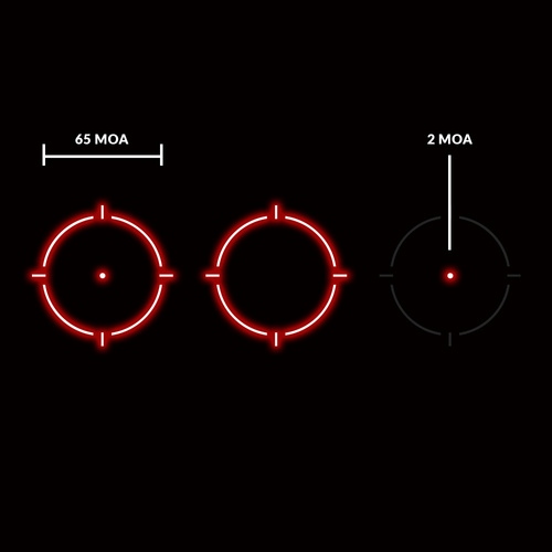Dostosuj znak celowniczy do sytuacji. Wybierz klasyczną czerwoną kropkę 2 MOA, okrąg 65 MOA lub ich kombinację – wszystko to dostępne z poziomu intuicyjnego systemu MRS. Z 12 poziomami jasności (w tym 4 trybami noktowizyjnymi) celownik sprawdzi się zarówno w ostrym słońcu, jak i w całkowitym mroku.