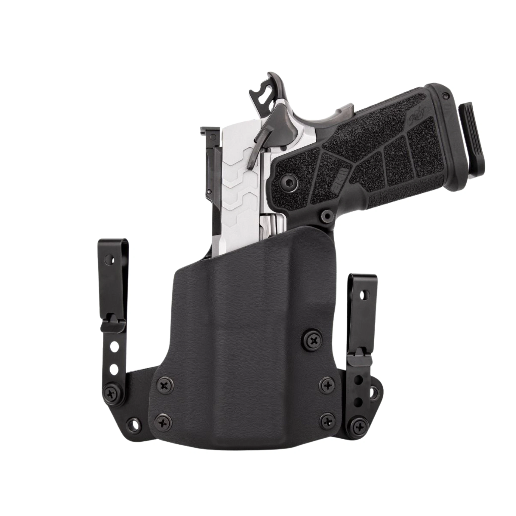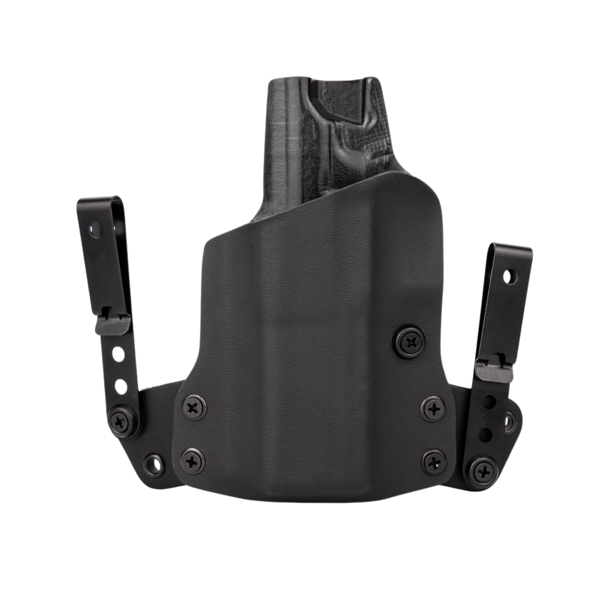 Regulowane, metalowe klipsy IWB o szerokości 1,75" umożliwiają zmianę kąta pochylenia (cant) oraz wysokości osadzenia, co pozwala dopasować ustawienie do indywidualnych preferencji i różnych pozycji noszenia – od appendix po small of the back.