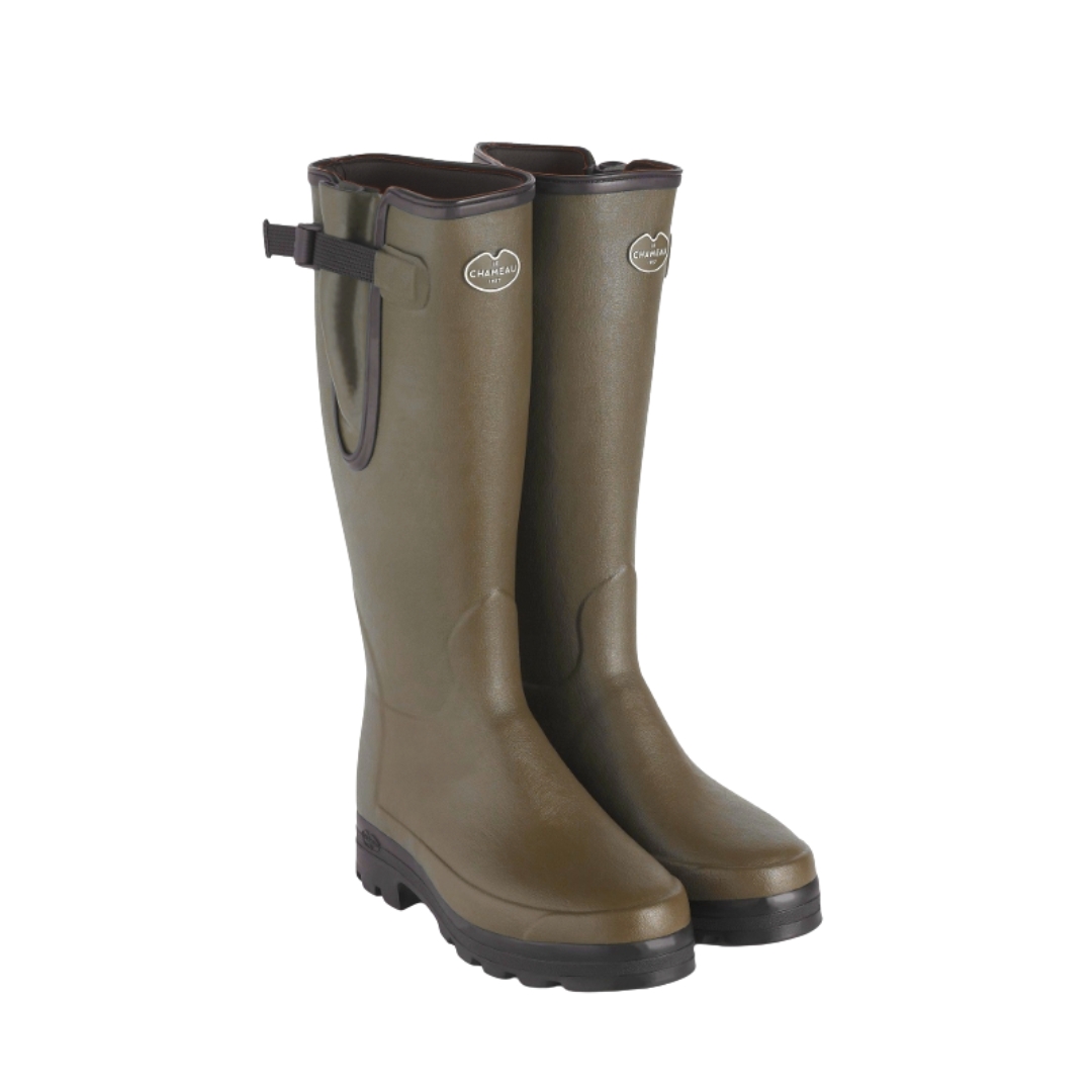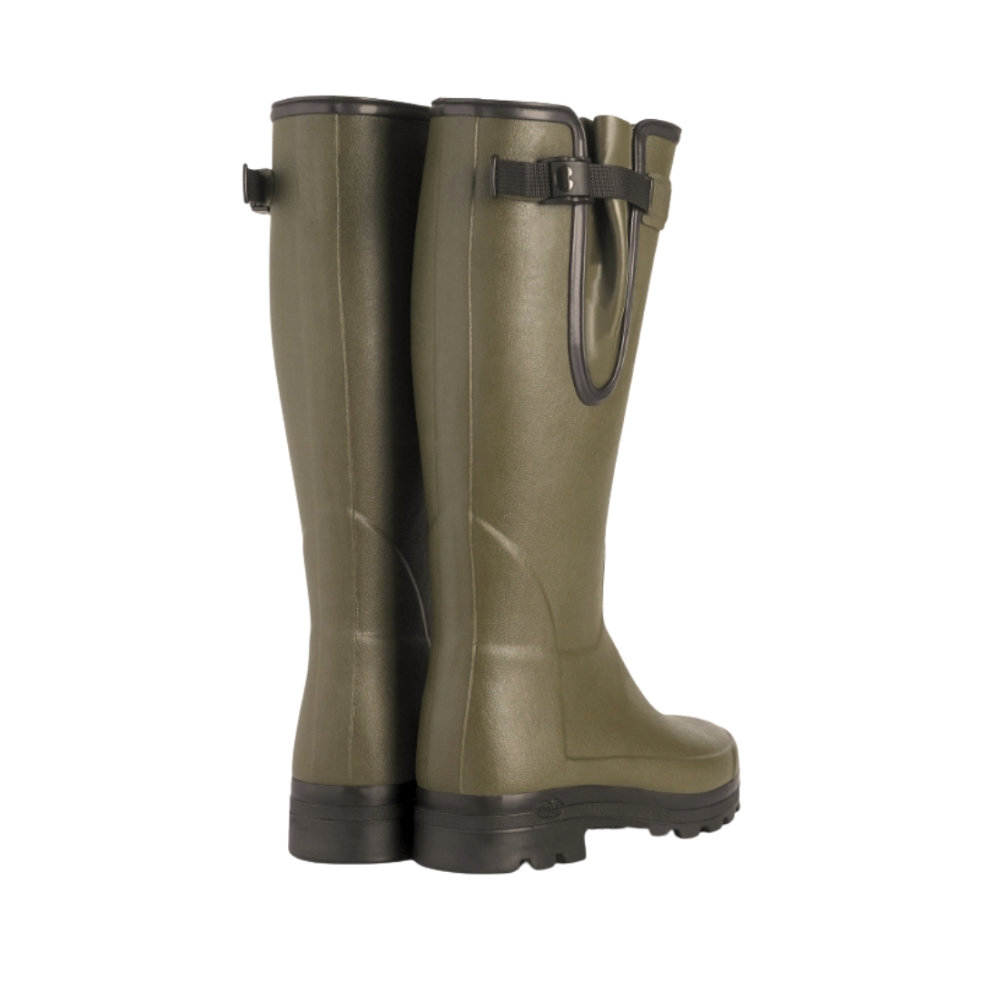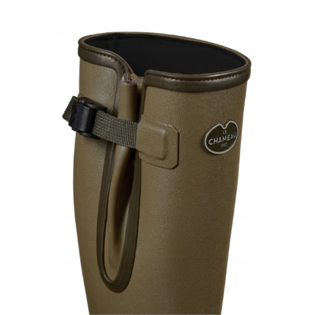 Kalosze myśliwskie marki Le Chameau wykonane ręcznie z naturalnego kauczuku. Buty posiadają podszewkę z komfortowego 3mm neoprenu, dzięki czemu nadają sie na polowania w chłodne i zimne dni.  Podeszwa typu Grip o mocnym protektorze z dobrą przyczepnością znakomicie sprawdza się w trudnym terenie. Podwójna gęstość gumy oraz wzmocnienie w podbiciu zwiększają trwałość kaloszy. Pasek spinający umożliwia dopasowanie kalosza do łydki.