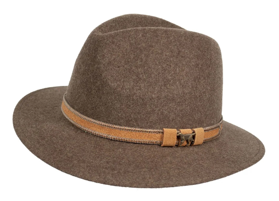 Kapelusz myśliwski wykonany z wodoodpornej wełny. Jest obszyty paskiem z prawdziwej skóry i ma ozdobnego psa z boku paska. Wykonany jest w 100% z wełny, dzięki czemu jest bardzo wytrzymały i wodoodporny. Kapelusz można zgina, zwijać lub wkładać do kieszeni bez uszczerbku dla świetnego dopasowania i dobrej formy.