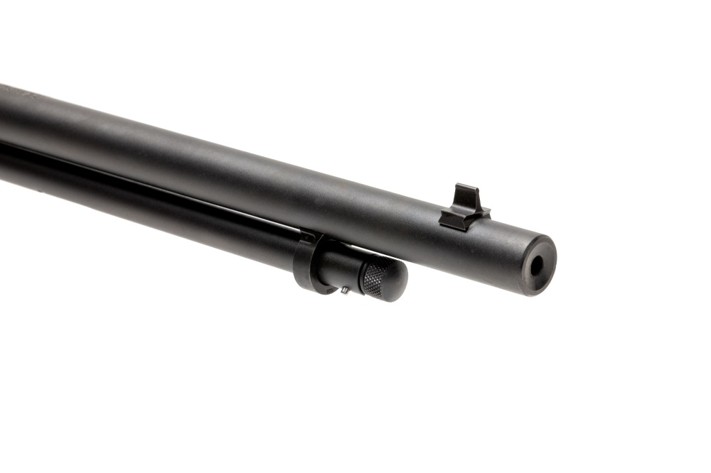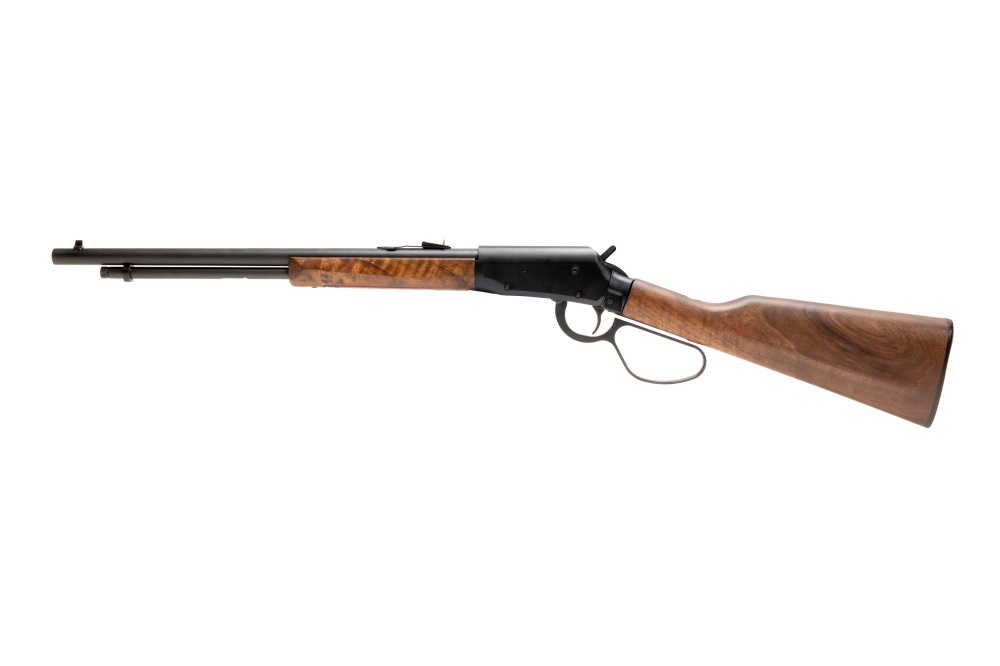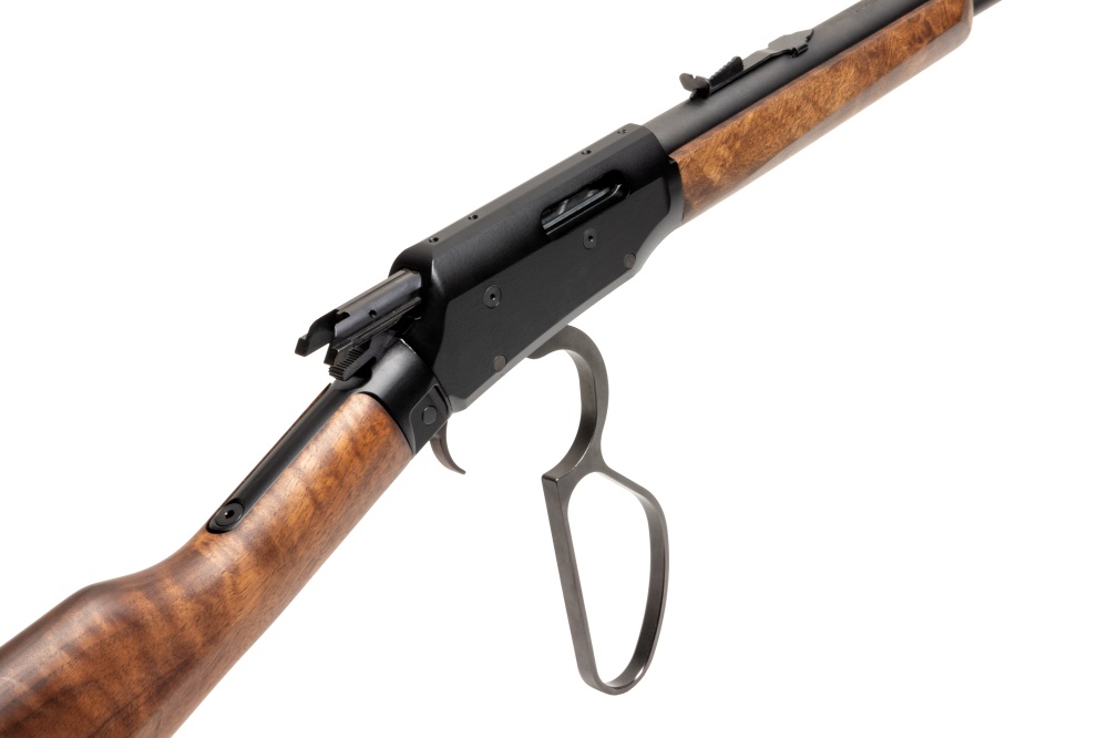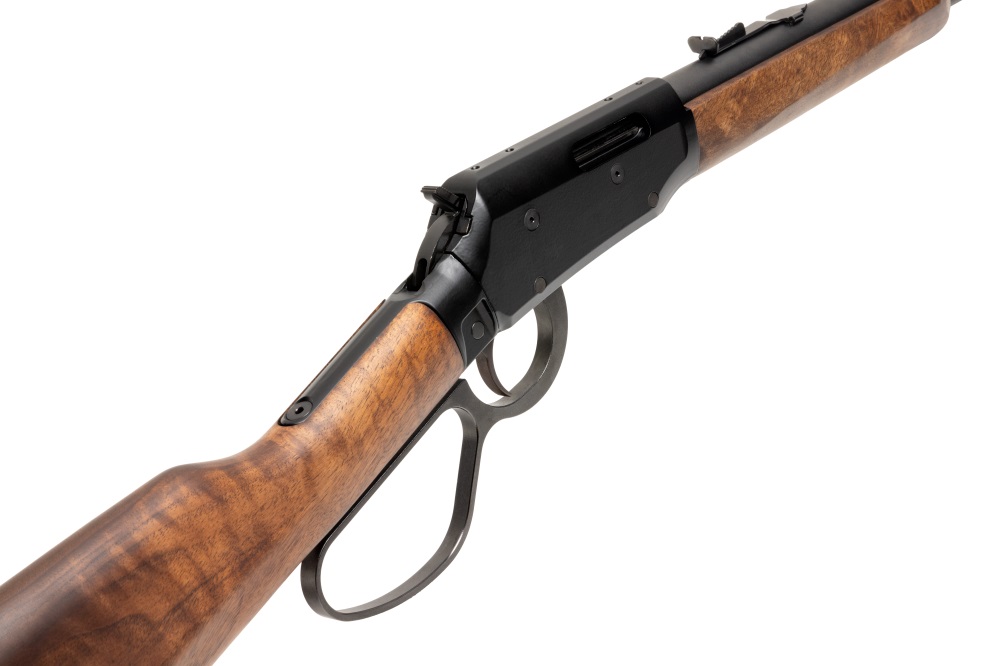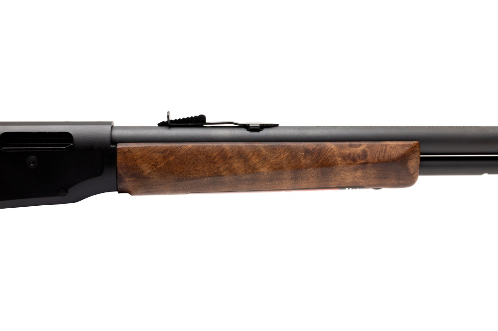 Karabin wyposażony został w elegancką kolbę z drewna orzechowego w satynowym wykończeniu, która nie tylko świetnie się prezentuje, ale zapewnia pewny chwyt i wygodę użytkowania. Mechanizm lever-action działa płynnie i niezawodnie, a powiększona pętla dźwigni ułatwia obsługę – nawet w rękawicach.