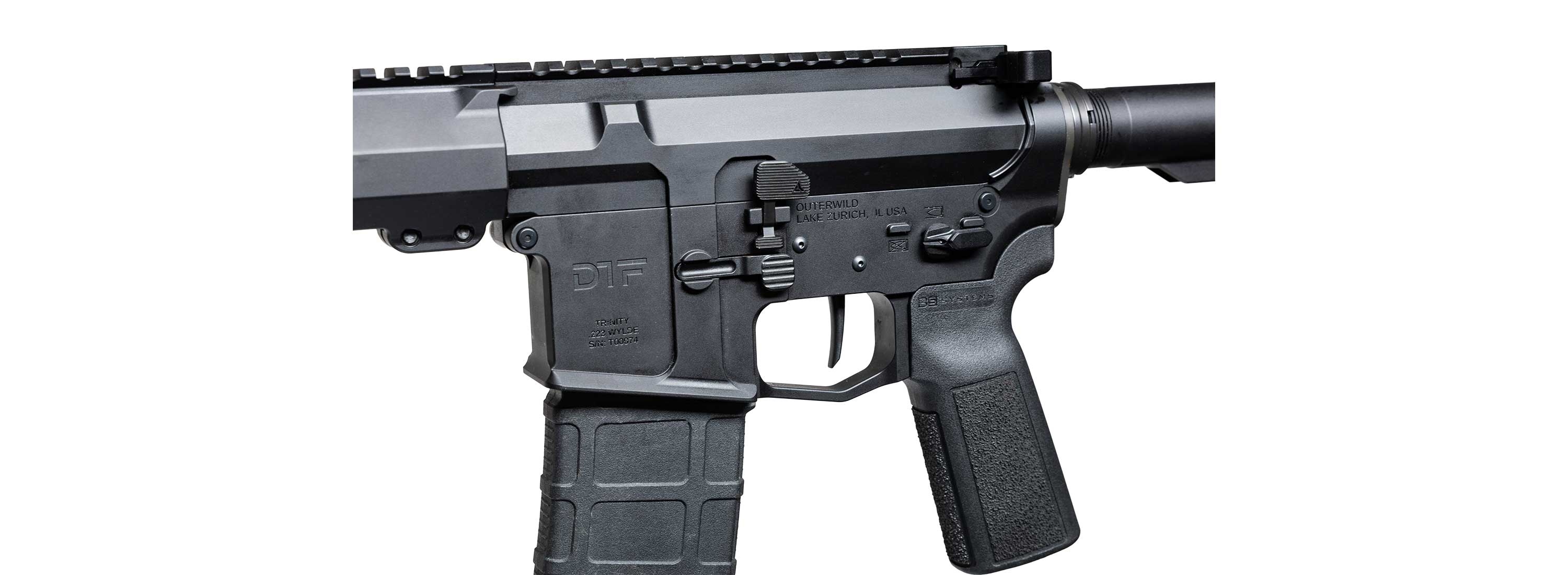 Trinity to w pełni dwustronna konstrukcja — dwustronna rączka przeładowania Radian Raptor-SD, dwustronny bezpiecznik Radian Talon, dwustronny zrzut magazynka i przycisk zwalniający suwadło. Przesunięty dosyłacz zmniejsza ryzyko zaczepienia paznokciem podczas przeładowania jednoręcznego. Spust Rise Armament RA-434 (jednostopniowy) o oporze 3,5 lb (ok. 1,5 kg) daje idealny kompromis między szybkością a precyzją.
