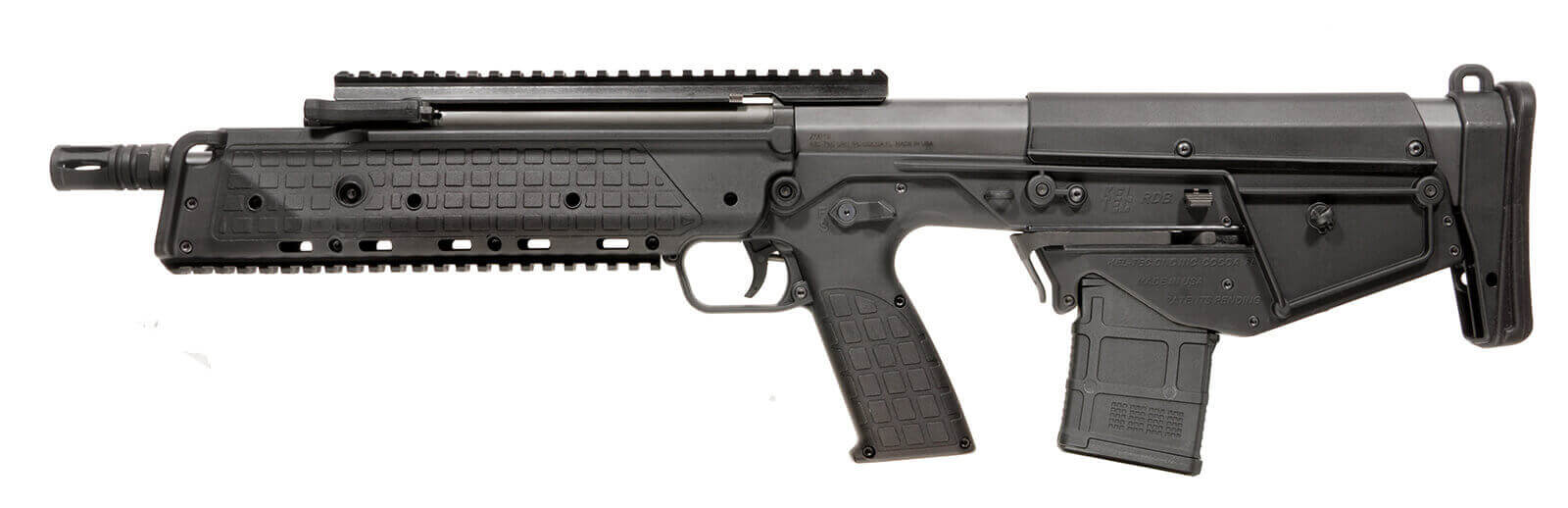 Karabinek KEL-TEC RDB 20 zielony kal. 223Rem posiada obustronny bezpiecznik oraz rączkę przeładowania która znajduje się z przodu po lewej stronie broni. Łuski wyrzucane są w dół. Karabinek zasilany jest ze standardowych magazynków dla platformy AR-15. Dźwignia zrzutu zamka znajduje się nad magazynkiem zarówno po prawej jak i po lewej stronie.
