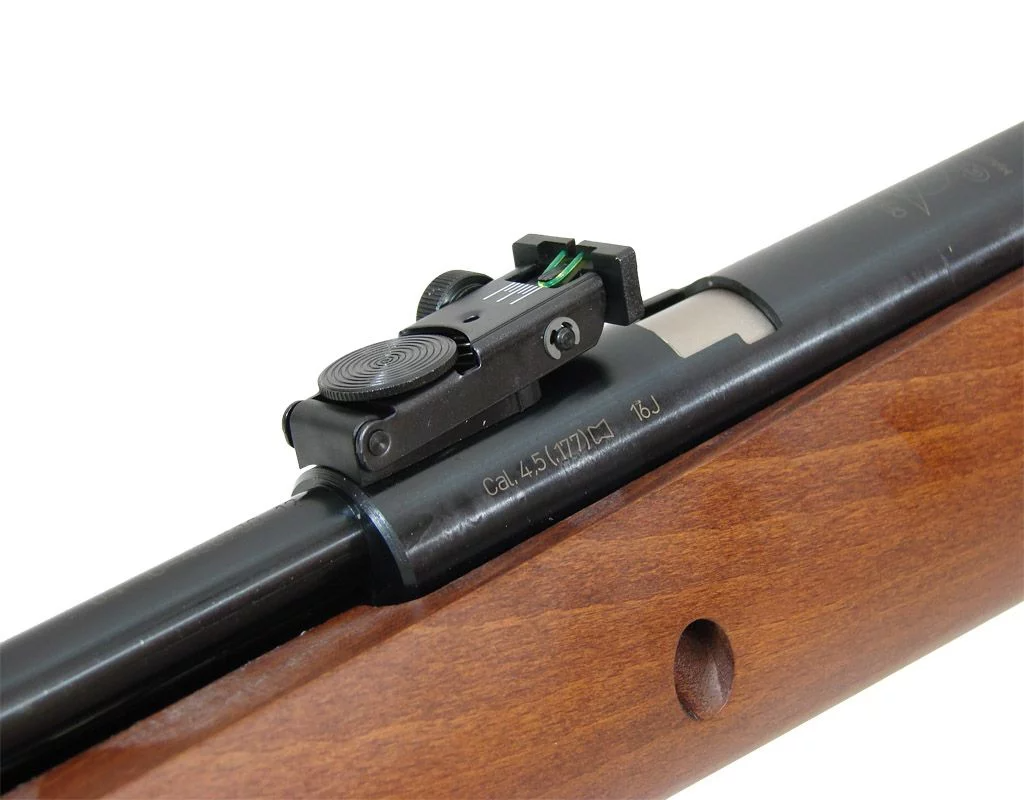 **Precyzja strzałów** jest tu na najwyższym poziomie, dzięki zastosowanej gwintowanej lufie o długości 44 cm, kalibru 4,5 mm. Mechaniczne przyrządy celownicze z światłowodami w kolorze czerwonym i zielonym pozwalają na szybkie i dokładne celowanie, nawet w trudniejszych warunkach oświetleniowych. Dodatkowo, na grzbiecie karabinka znajduje się szyna montażowa, która umożliwia instalację celownika optycznego lub kolimatora, co czyni go niezwykle wszechstronnym.