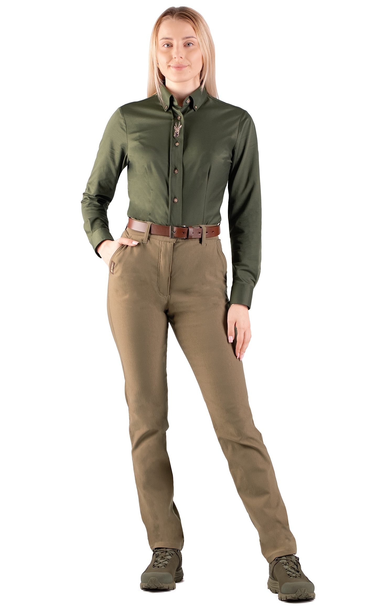 Wykonana z wysokogatunkowej, oddychającej bawełny zapewnia komfort przez cały dzień, nawet przy intensywniejszym użytkowaniu. Z przodu koszuli znajduje się delikatny haft z głową koziołka – motyw bliski miłośniczkom natury i łowiectwa. Całość dopełniają guziki imitujące poroże, które dodają koszuli charakterystycznego, stylowego wykończenia.