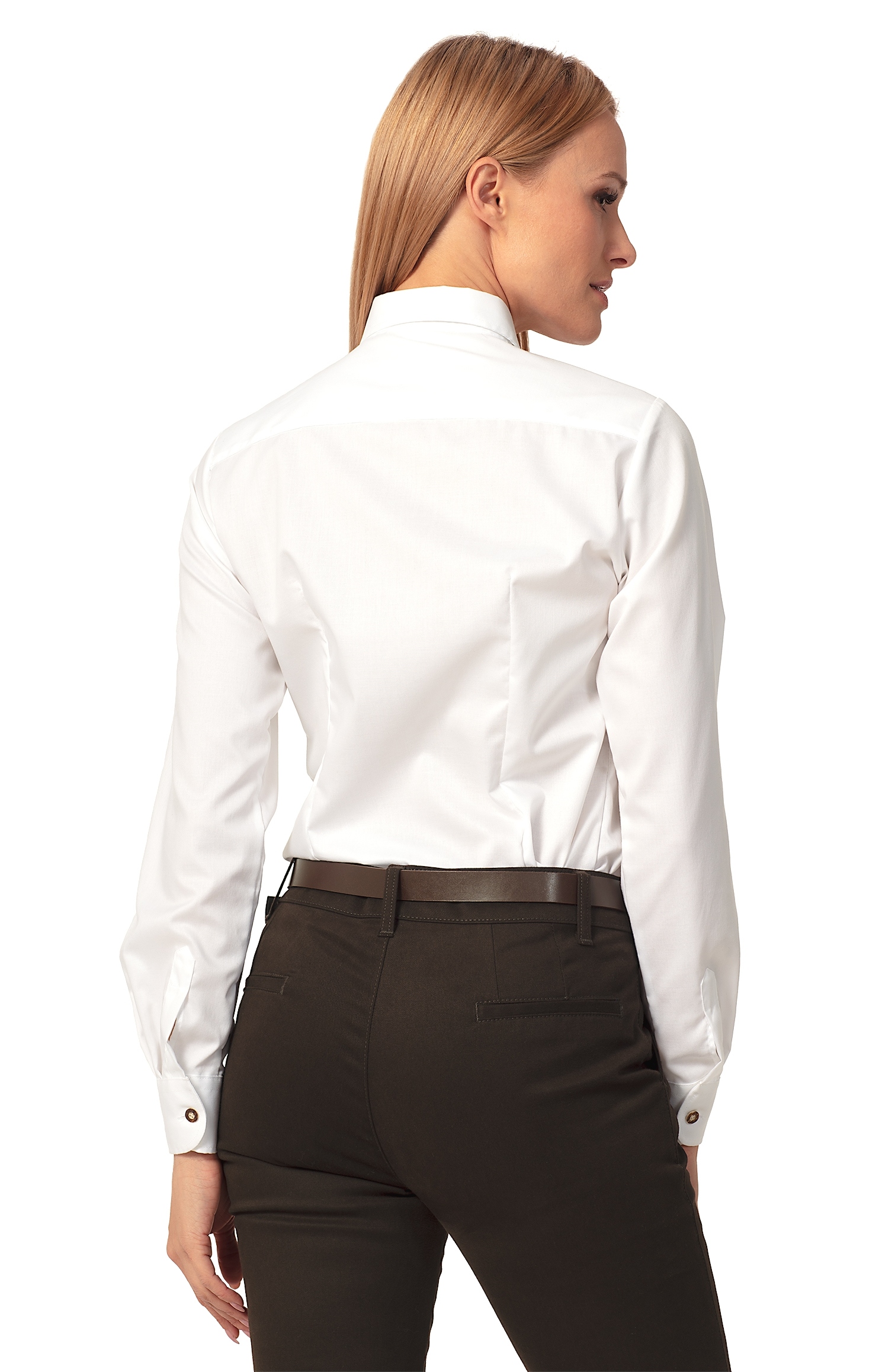 Koszula Koziołek Lady to elegancka propozycja dla kobiet, które cenią połączenie klasycznego stylu z delikatnym akcentem natury. Biel materiału została przełamana haftem z głową koziołka oraz subtelnymi guzikami imitującymi poroże – to drobne detale, które nadają koszuli unikalnego charakteru.