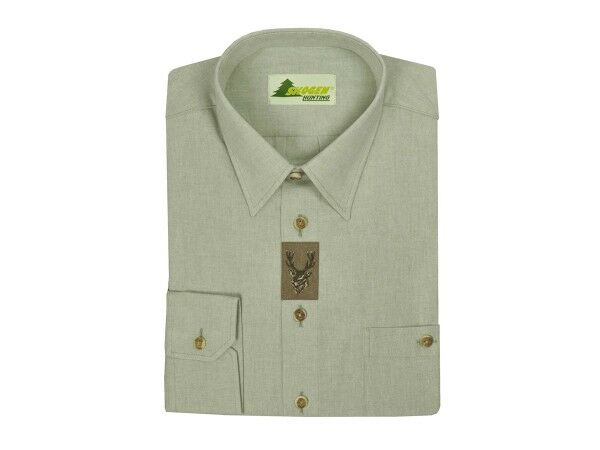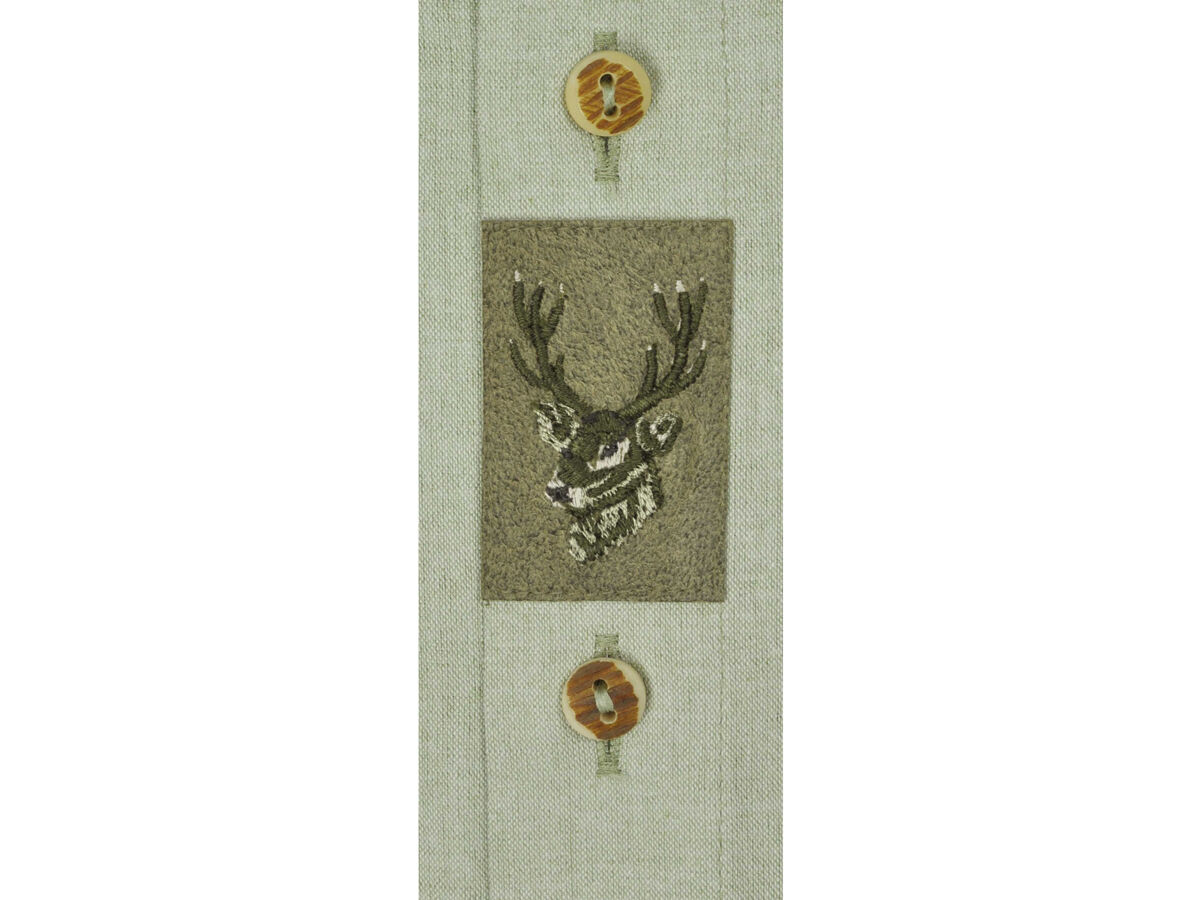 Solidny bawełniany materiał jest wyjątkowo wytrzymały i podkreśla solidny charakter limonkowej koszuli. Głowa jelenia jest bardzo szczegółowo wyhaftowana na aplikacji z prawdziwej skóry i zdobi rząd guzików zrobionych z poroża. Klasyczne udoskonalenia, takie jak stałe guziki na mankietach i kieszeń na piersi, którą można zamknąć za pomocą guzika, dopełniają szlachetny, tradycyjny i funkcjonalny wygląd koszuli.