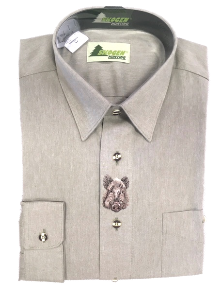 Koszula myśliwska niemieckiej firmy Skogen wyprodukowana z najlepszych jakościowo materiałów. Koszula z długim rękawem, klasyczny krój. Mankiety zapinane na guziki. W części środkowej koszuli widnieje piękny haft z motywem myśliwskim. Na piersi po lewej posiada kieszonkę, a po środku wyhaftowany motyw myśliwski.