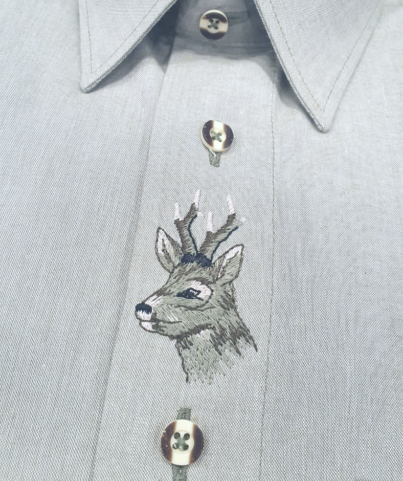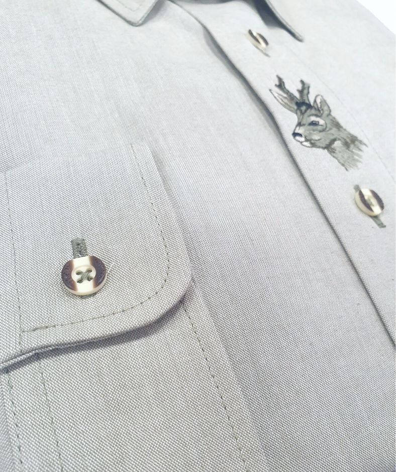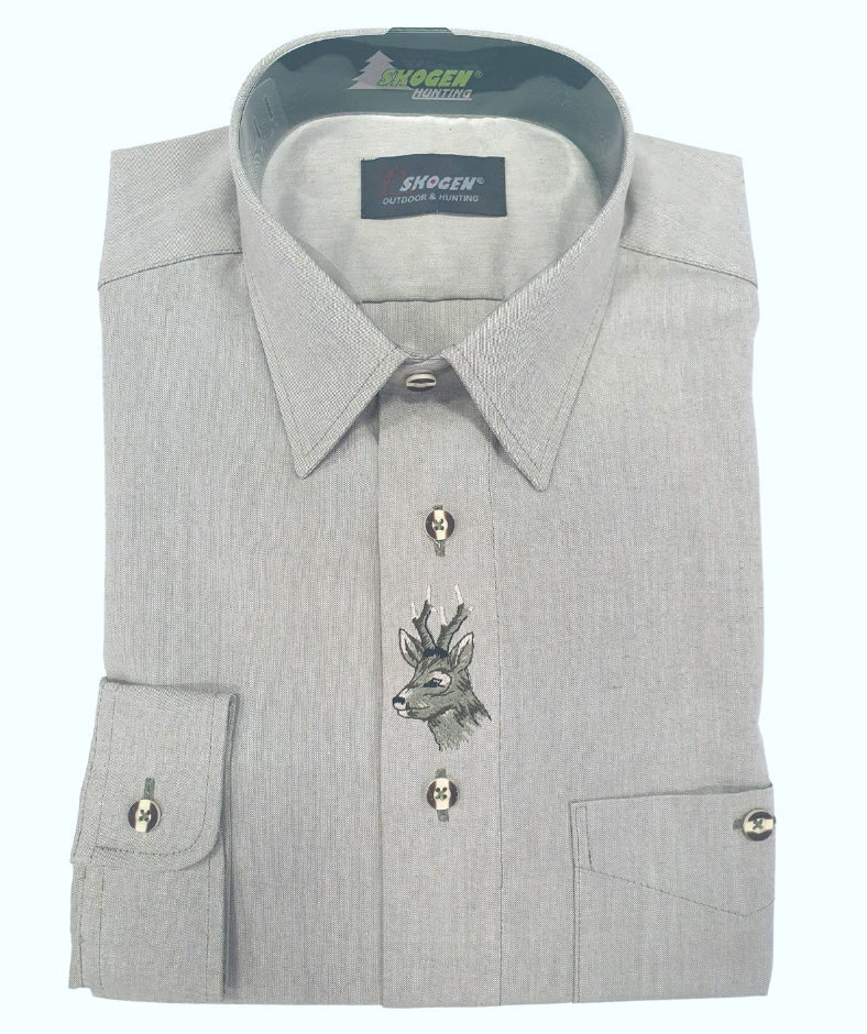 Koszula myśliwska niemieckiej firmy Skogen wyprodukowana z najlepszych jakościowo materiałów. Koszula z długim rękawem, klasyczny krój. Mankiety zapinane na guziki. W części środkowej koszuli widnieje piękny haft z motywem myśliwskim. Na piersi po lewej posiada kieszonkę, a po środku wyhaftowany motyw myśliwski.