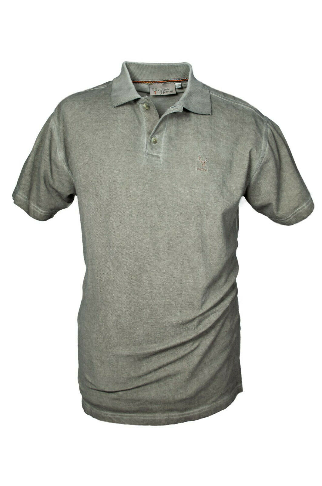 Lekka męska koszulka polo wykonana z wytrzymałej bawełnianej tkaniny w ładnie spranym wyglądzie. Posiada kontrastowy kołnierzyk, boczne rozcięcie oraz dyskretną etykietę Hubertus na lewym rękawie.