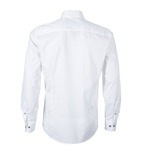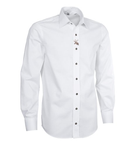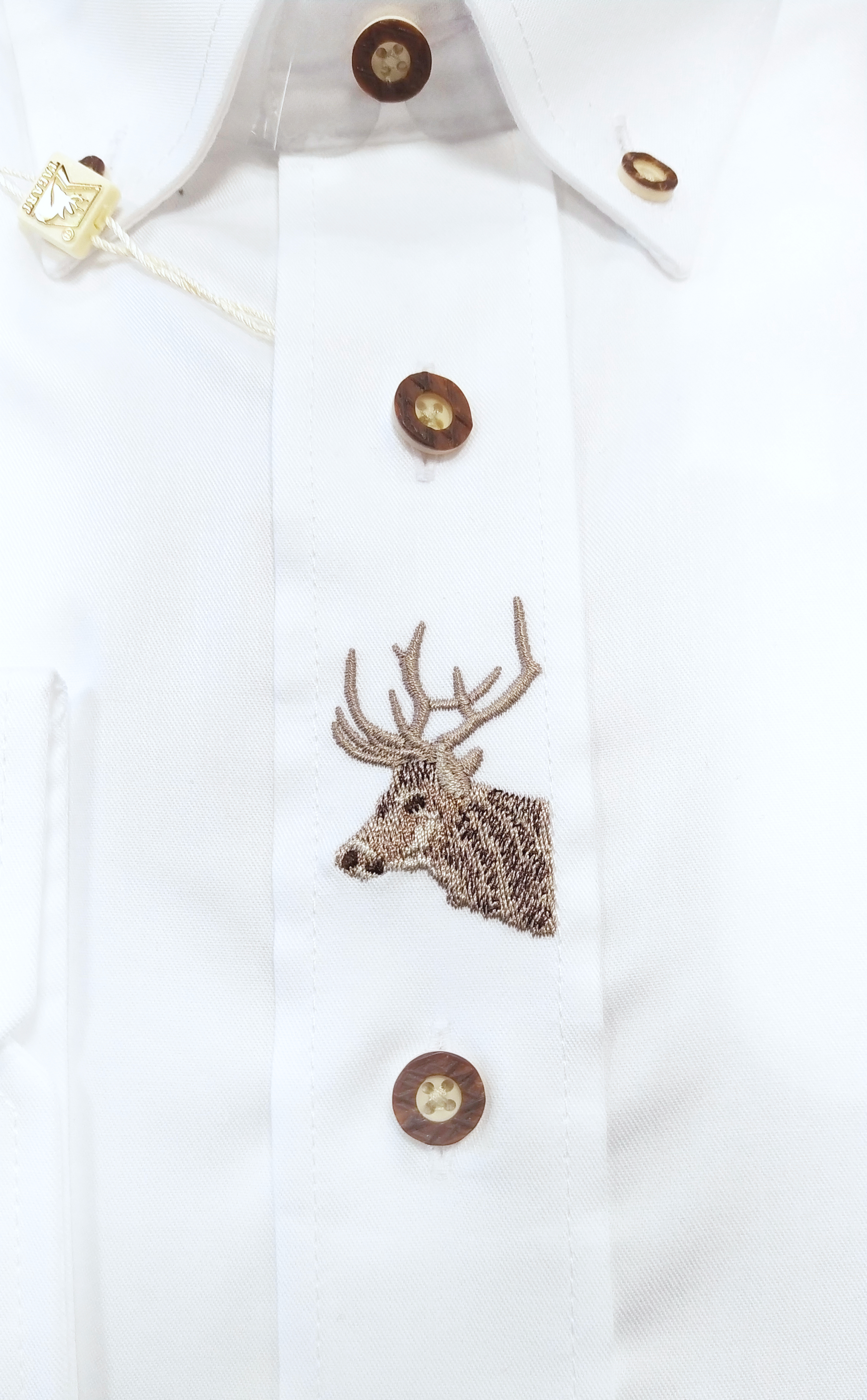 Elegancka koszula bawełniana w białym kolorze. Na plisie wyhaftowana głowa jelenia z porożem. Guziki z imitacji poroża nadają jej typowo myśliwskiego charakteru.