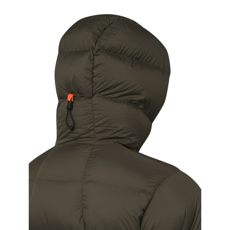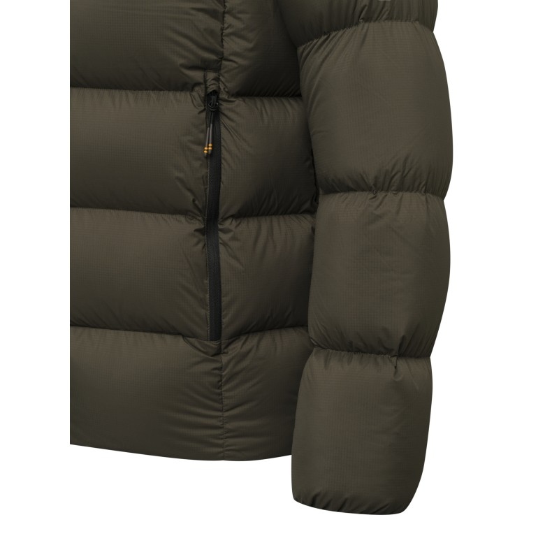 Wypełnienie z ponad 300 g naturalnego puchu gęsiego (90% puch, 10% pierze) gwarantuje doskonałą izolację termiczną nawet przy bardzo niskich temperaturach. Materiał zewnętrzny to matowy, w 100% recyklingowany poliamid ripstop o gramaturze 20 denierów – lekki, odporny na rozdarcia i pokryty powłoką DWR (Durable Water Repellent), która skutecznie chroni przed deszczem i wiatrem.