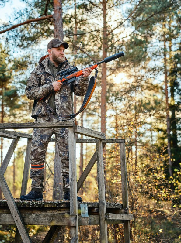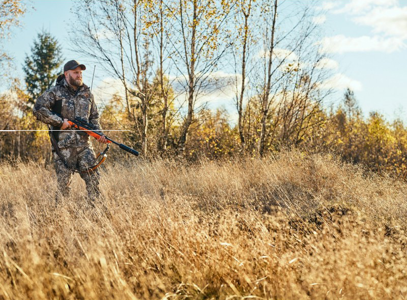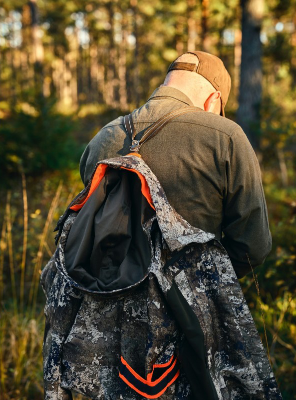 Wiatro i wodoodporna kurtka myśliwska w oficjalnym True Timber® Camou z pomarańczowym kołnierzem dla dodatkowej widoczności.
