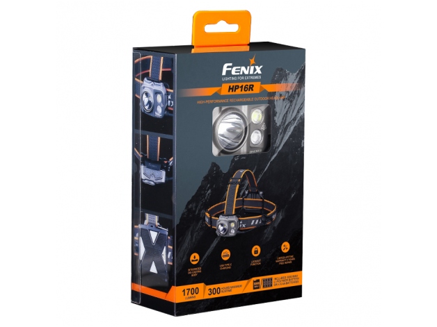Fenix HP16R to profesjonalna czołówka o sumarycznym strumieniu 1250 lumenów, wyposażona w 3 diody emitujące światło skupione, rozproszone i czerwone, system szybkiego ładowania USB-C, oraz dwa przyciski sterujące. Latarka ma zewnętrzny pojemnik na akumulator, pozwalający na zamienne stosowanie baterii AA.