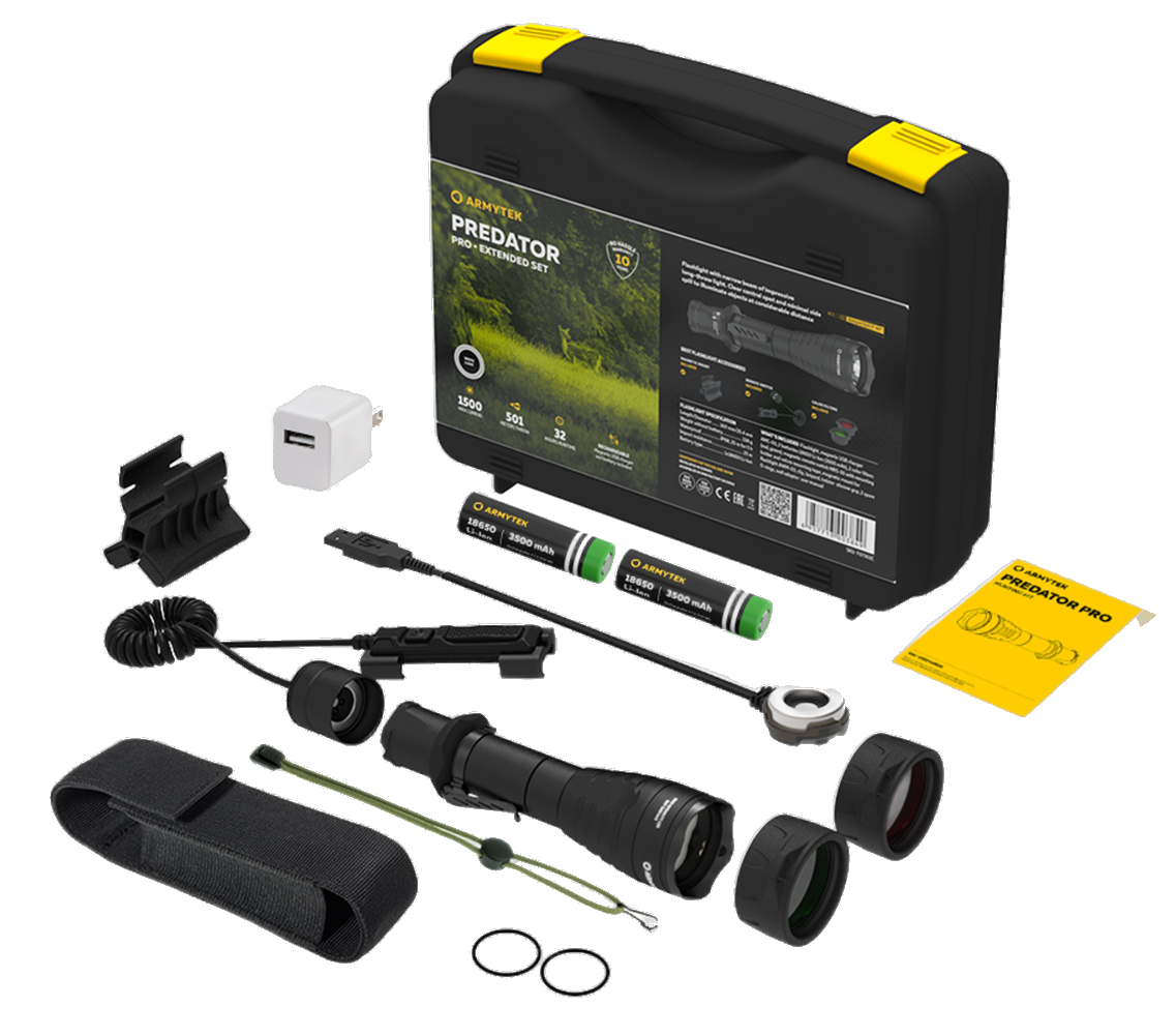 Predator Pro Extended Set — to gotowe rozwiązanie zapewniające maksymalną wydajność na polowaniu. Zestaw zawiera latarkę taktyczną Predator Pro o największym zasięgu z ładowarką magnetyczną oraz najlepsze akcesoria do niej.