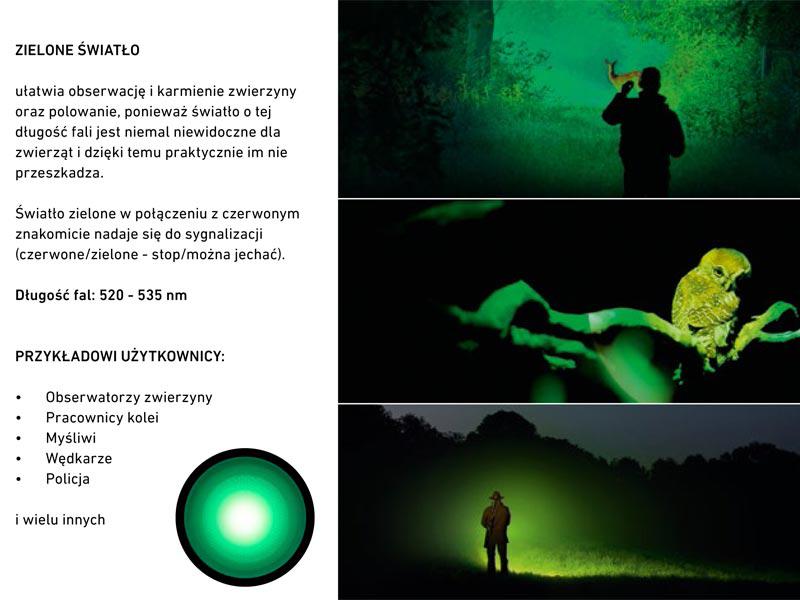 ZIELONE ŚWIATŁO ułatwia obserwację i karmienie zwierzyny oraz polowanie, ponieważ światło o tej długość fali jest niemal niewidoczne dla zwierząt i dzięki temu praktycznie im nie przeszkadza. Światło zielone w połączeniu z czerwonym znakomicie nadaje się do sygnalizacji (czerwone/zielone - stop/można jechać). Długość fal: 520 - 535 nm