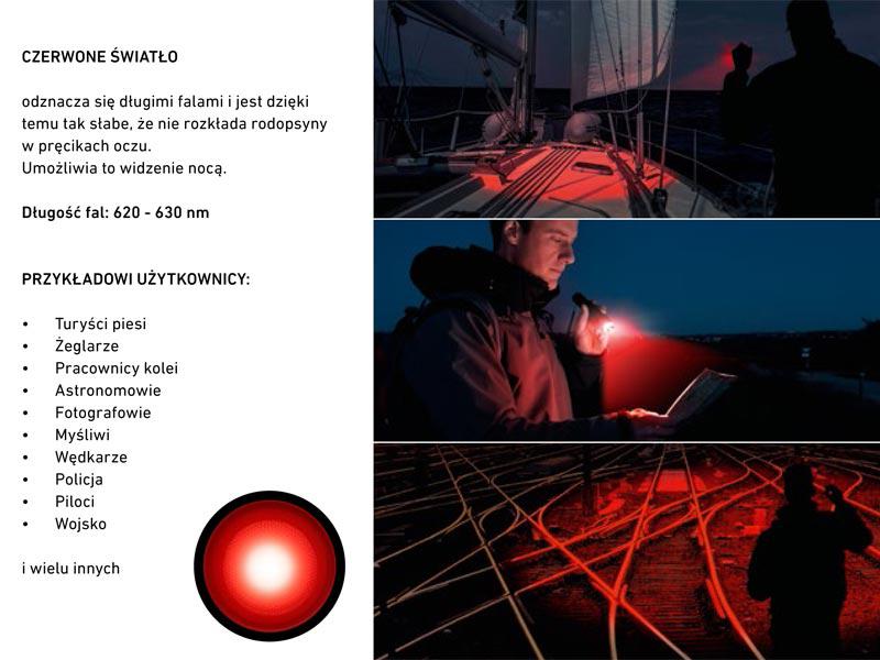 CZERWONE ŚWIATŁO odznacza się długimi falami i jest dzięki temu tak słabe, że nie rozkłada rodopsyny w pręcikach oczu. Umożliwia to widzenie nocą. Długość fal: 620 - 630 nm