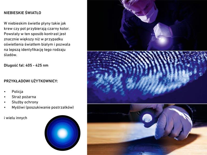 NIEBIESKIE ŚWIATŁO W niebieskim świetle płyny takie jak krew czy pot przybierają czarny kolor. Powstały w ten sposób kontrast jest znacznie większy niż w przypadku oświetlenia światłem białym i pozwala na lepszą identyfikację tego rodzaju śladów. Długość fal: 405 - 425 nm