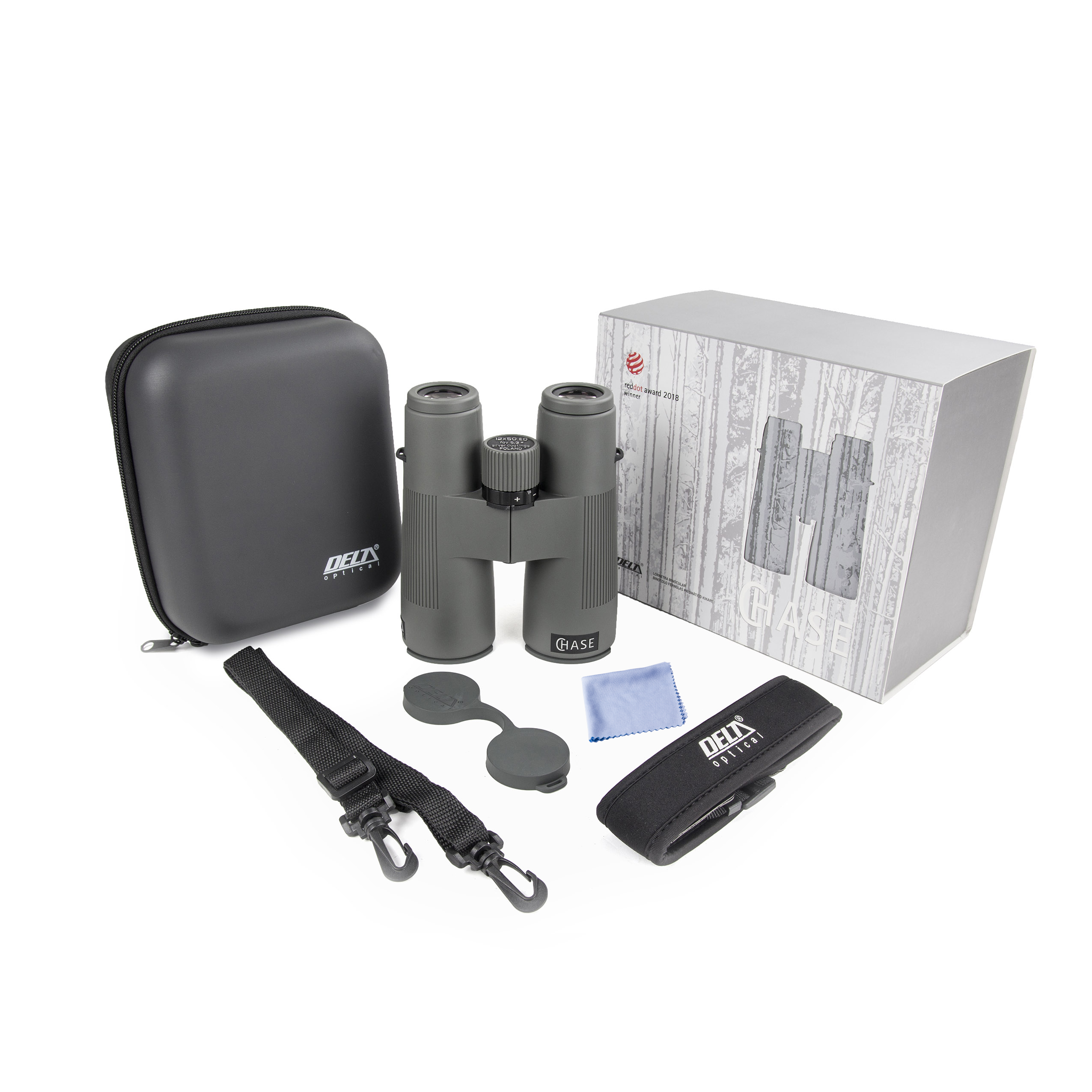 Lornetka Delta Optical Chase 10x50 to model o uniwersalnych parametrach, doskonale nadający się zarówno do obserwacji przyrodniczych jak i myśliwskich. Rozmiar lornetki jest nieco większy niż w przypadku modeli z obiektywem o średnicy 42 mm, jednak lornetka ta jest wyraźnie lżejsza od typowych lornetek 10x50, a jej masa nie przekracza 775 g. Pole widzenia jest duże i wynosi 6,3°, dzięki zastosowaniu komfortowych okularów szerokokątnych z wygodnie odsuniętą źrenicą wyjściową. Wszechstronna w zastosowaniach konstrukcja dachowa nadająca się do obserwacji myśliwskich, przyrodniczych czy też turystycznych. Lornetka klasy premium, z 50 mm obiektywami wykonanymi ze szkła typu ED o bardzo niskiej dyspersji. Umiarkowane gabaryty i niewielka masa w połączeniu z dużą wytrzymałością konstrukcji sprawiają, że jest to lornetka polecana wymagającym użytkownikom spędzającym czas w trudnym terenie.