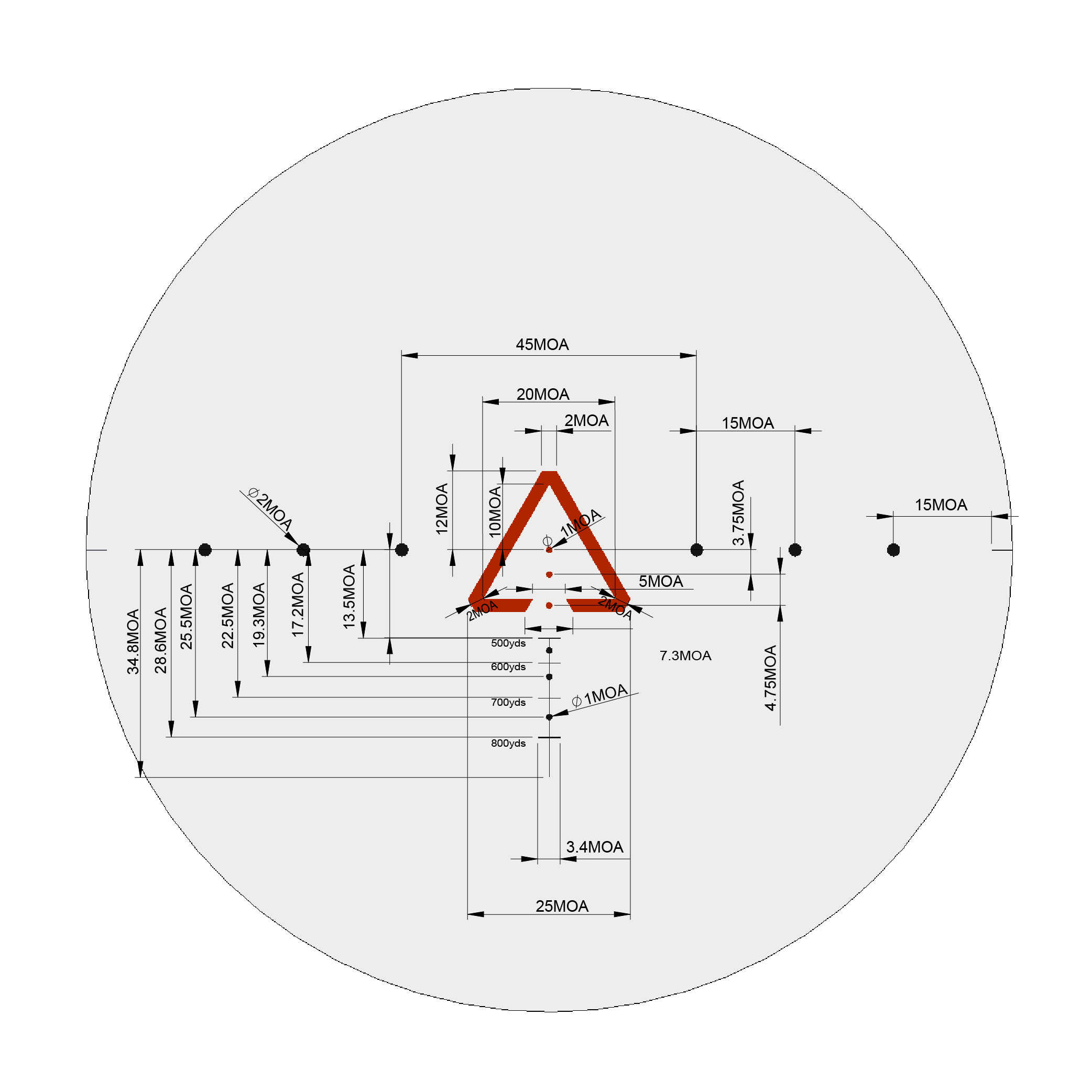 Luneta RW1 MOA TORERO została wyposażona w siatkę celowniczą MRB-W, która zawiera kropkę 1 MOA otoczoną okręgiem 4 MOA. Każda podziałka na siatce odpowiada 1 MOA na poziomej skali, co umożliwia precyzyjne korekty strzału.