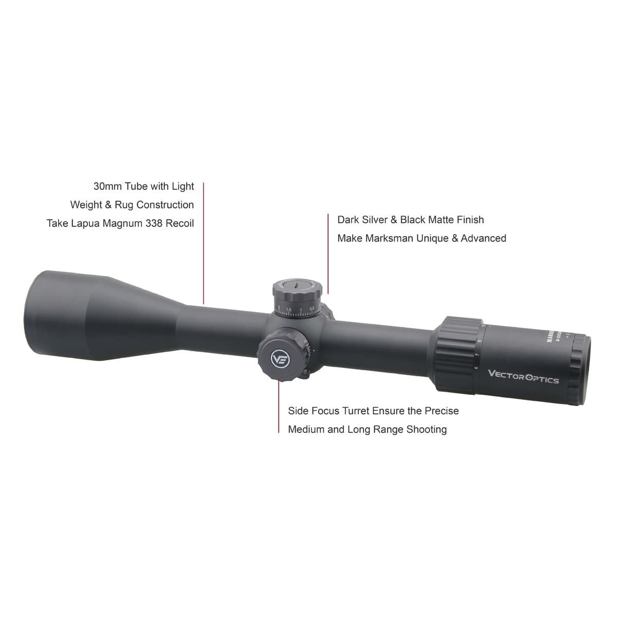 Marksman to lunety sprawdzone na każdym polu zastosowań. Model 6-24x50 posiada specjalnie zaprojektowaną siatkę celowniczą w pierwszym planie. Oznacza to że obraz siatki powiększa się wraz ze zwiększaniem powiększenia obrazu w lunecie. Pionowe i poziomowe zewnętrzne bębny balistyczne z wyraźnym "klikiem"(1/10MIL) o zakresie regulacji 60 MOA (17,5MIL). Pokrętło regulacji paralaksy. Te cechy sprawiają że lunety Marksman są świetną propozycja dla strzelca sportowego, poszukującego dobrej jakości celownika w rozsądnej cenie. Produkt w szczególności rekomendujemy do użycia z karabinkami bocznego zapłonu oraz precyzyjnymi wiatrówkami. Powtarzalność nastaw została sprawdzona podczas wielu testów wytrzymałościowych w procesie produkcji. Luneta sprawdzi się nawet przy obciążeniach wywołanych przez odrzut kalibru .338 Lapua Magnum.