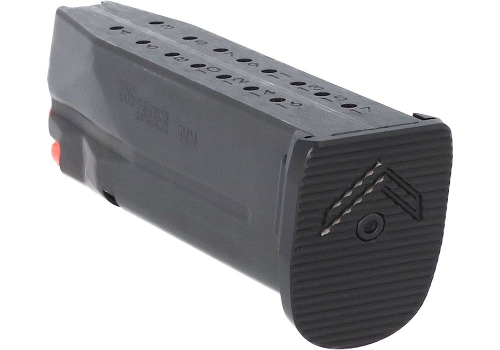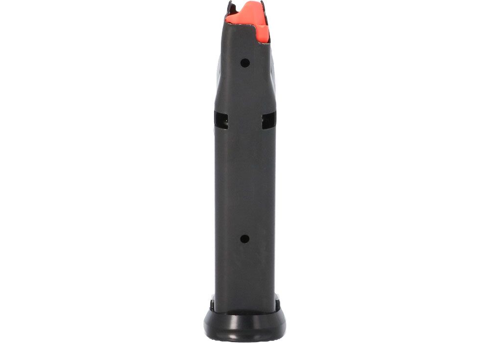 Fabryczny, stalowy magazynek na 17 naboi do pistoletu P365-AXG LEGION z aluminiową stopką Henning Group. Magazynek posiada tylne otwory kontrolne, pozwalające sprawdzić pojemność naboju, oraz pomarańczowy popychacz ułatwiający identyfikację rozładowanego naboju.