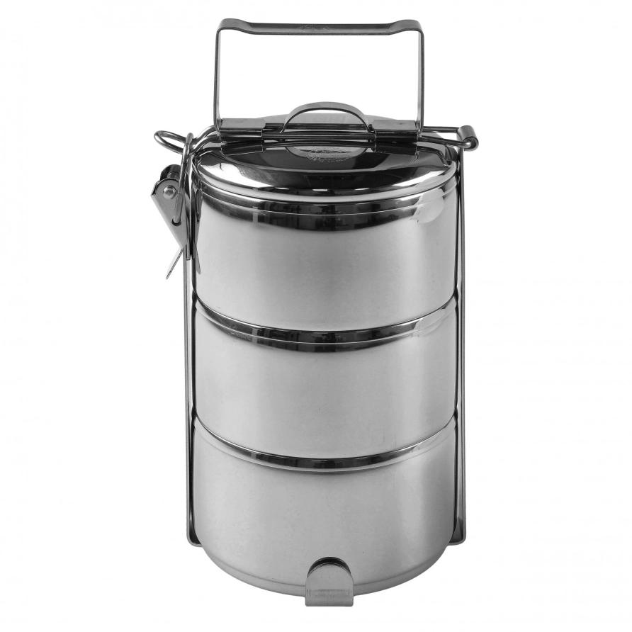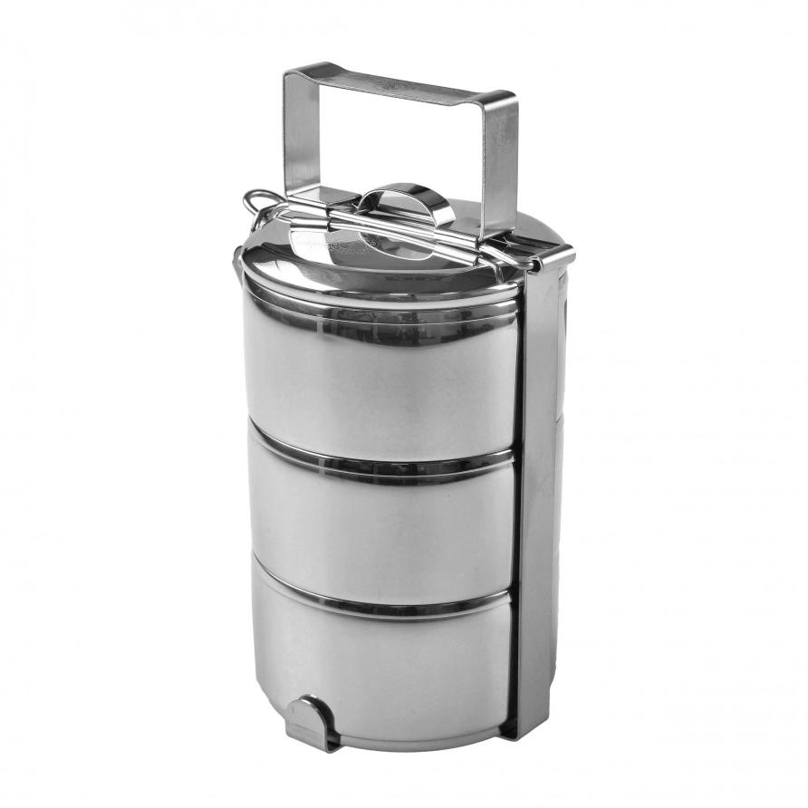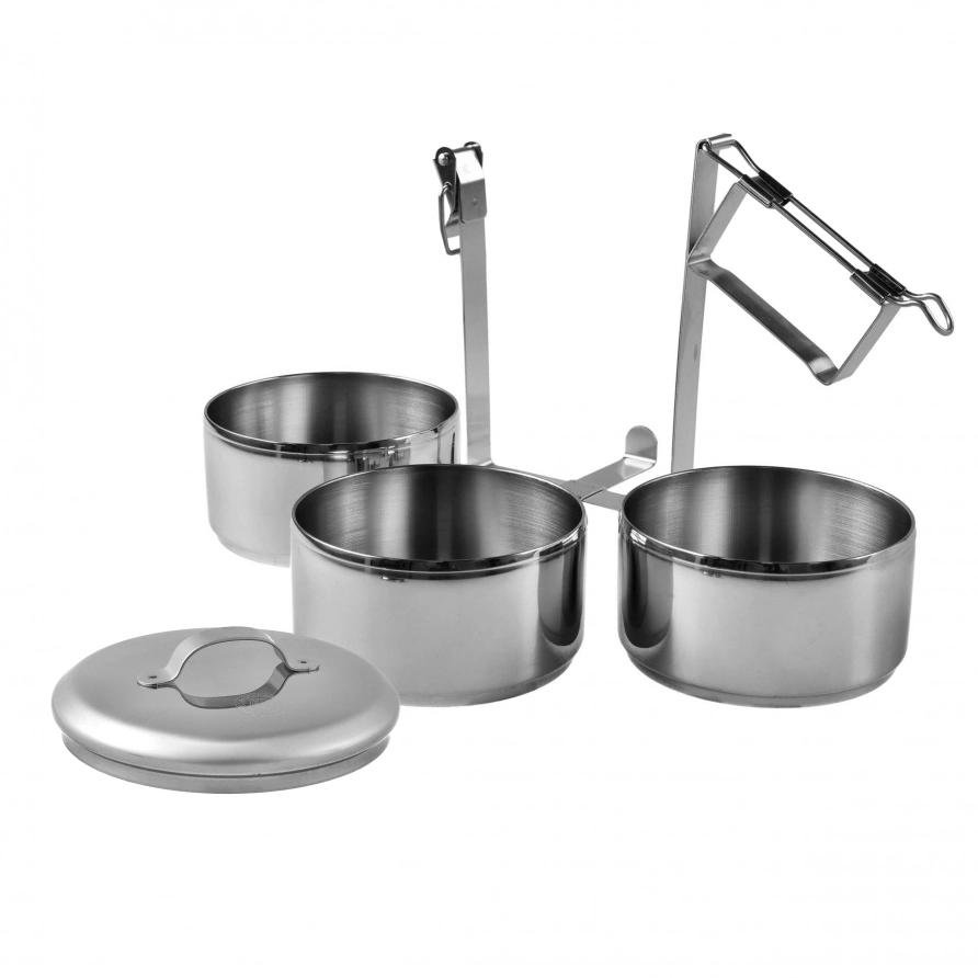 Zestaw tworzą trzy stalowe garnuszki o jednakowych wymiarach oraz dopasowana pokrywka. Całość spinana jest charakterystycznym, stabilnym uchwytem, który ułatwia transport i zapewnia pewność, że naczynia pozostaną na swoim miejscu. Wykonanie ze stali nierdzewnej 304 gwarantuje odporność na korozję, wysoką trwałość i łatwe czyszczenie – bez wchłaniania zapachów i z zachowaniem pełnej higieny.