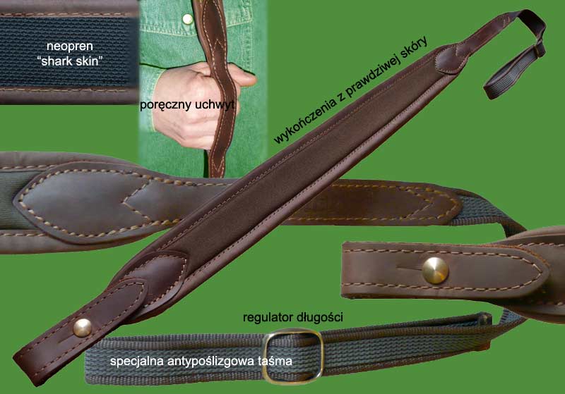 Ultralekki i wytrzymały neoprenowy pasek do broni wykończony prawdziwą skórą. Najwyższej jakości neopren typu "shark skin" o grubości 5mm! Specjalna antypoślizgowa taśma o szerokości 18 mm z regulatorem długości. Wyposażony w poręczny uchwyt ułatwiający stabilizowanie broni podczas marszu.
