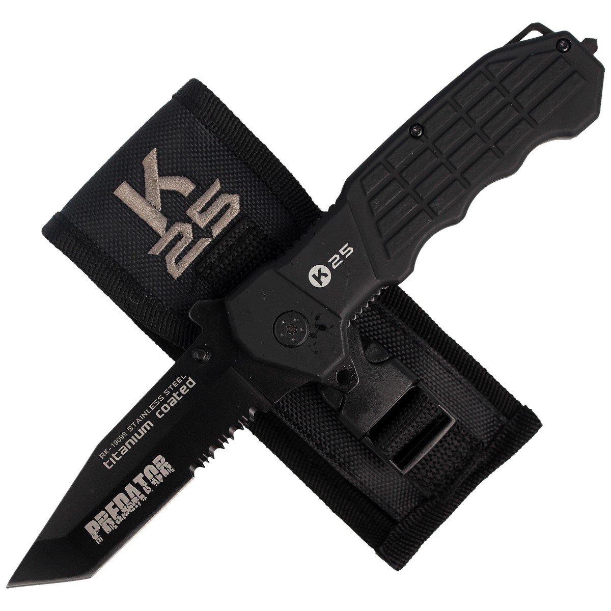 K25 Predator Rescue nóż taktyczno-ratowniczy PREDATOR BLACK z głownią ze stali nierdzewnej 440. Wyposażony w kołek z wolframu do bicia szyb, sprawdza się jako folder codziennego użytku EDC (Every Day Carry).