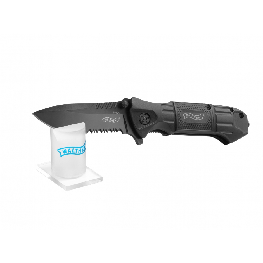 Walther BTK Black Tac to folder w taktycznym stylu, wyposażony w częściowo ząbkowaną głownię ze stali nierdzewnej 440C, blokadę liner-lock oraz awaryjny zbijak do szyb.