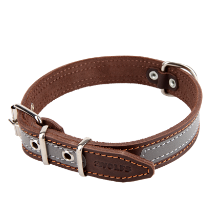 Uniwersalna obroża z regulacją długości wykonana ze skóry licowej z naszytym odblaskowym paskiem na całej długości doskonale poprawiającym widoczność psa w nocy, dodatkowo obszyta pomarańczową nitką.
