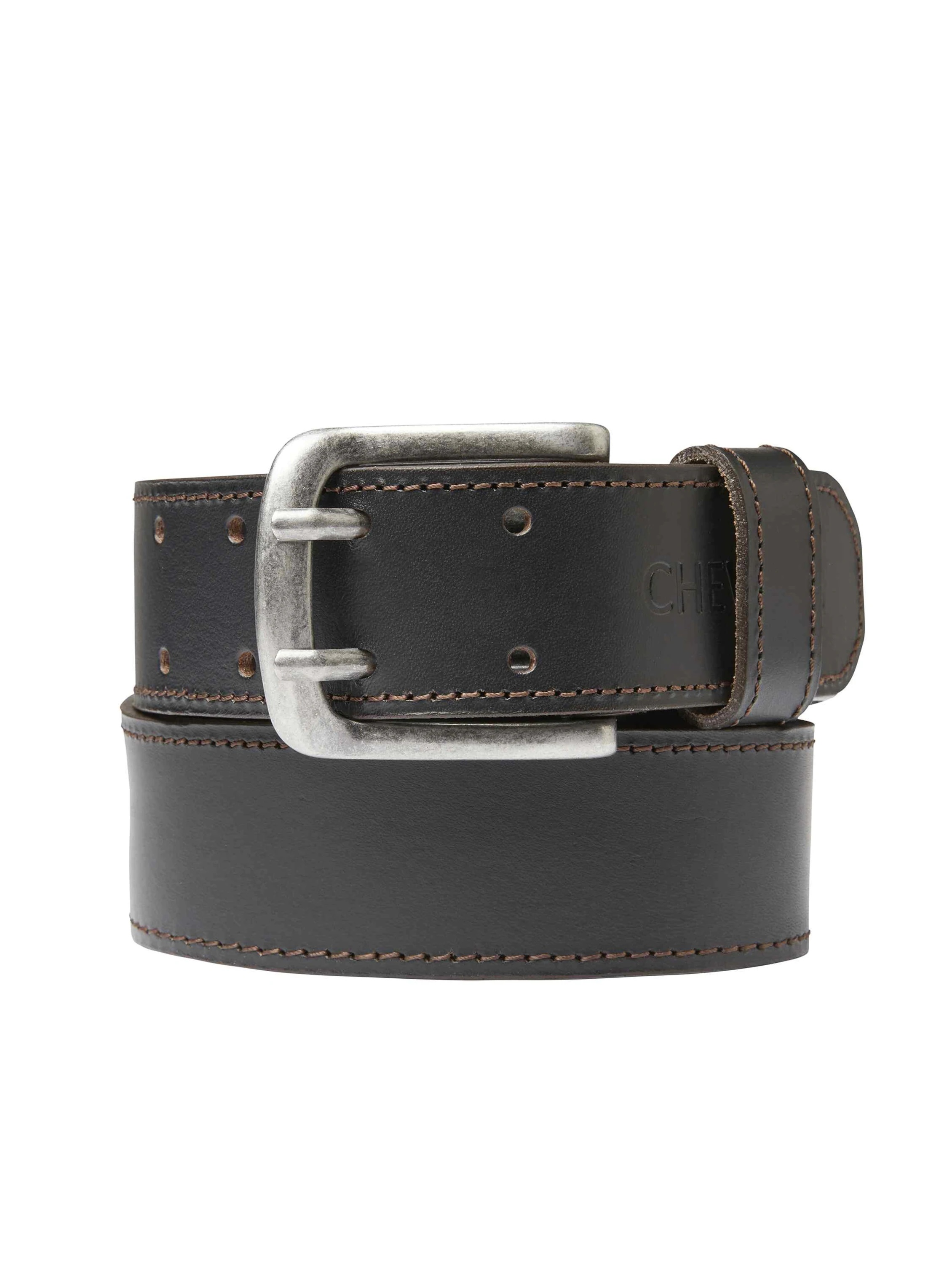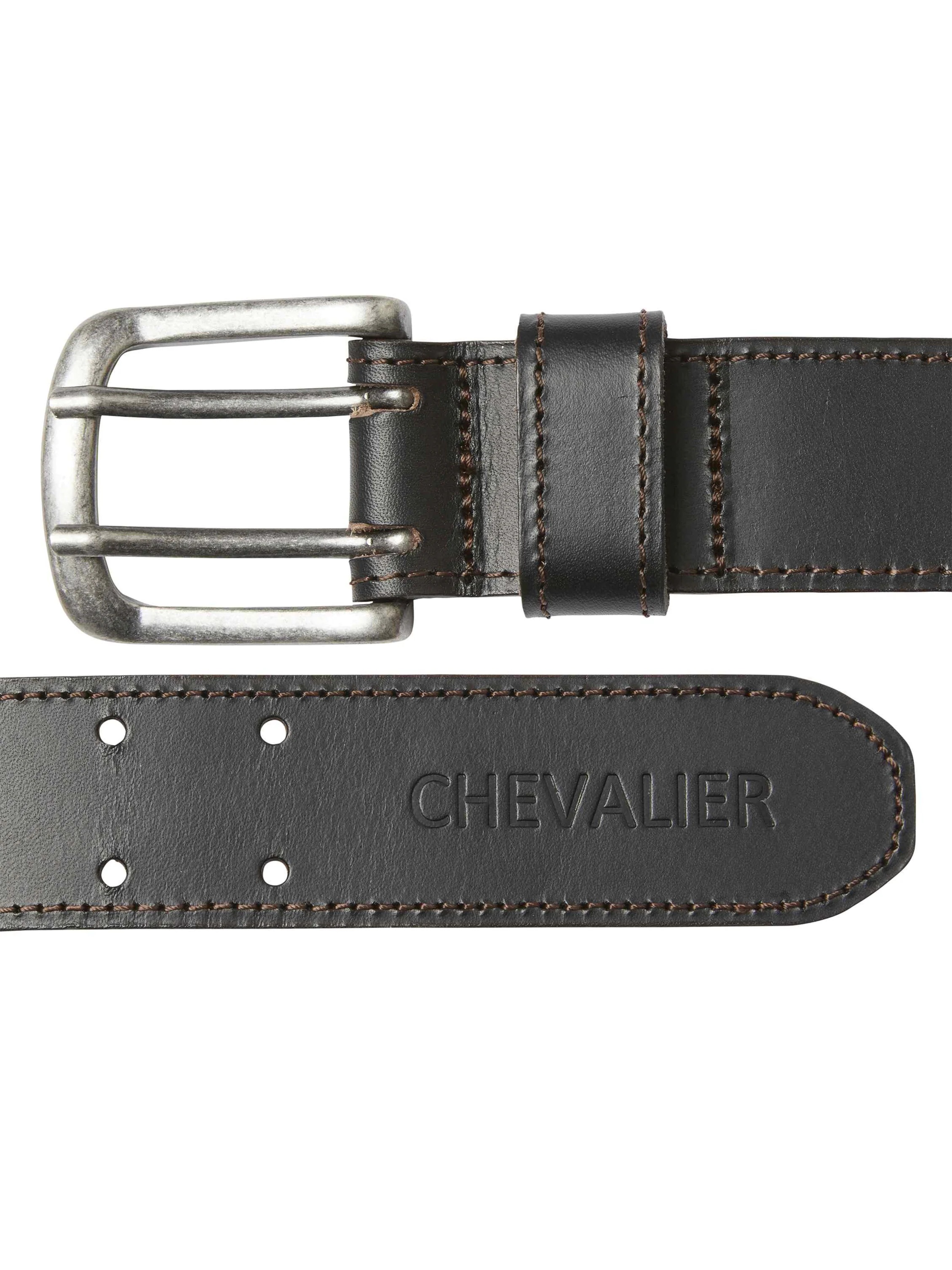 Solidny, szeroki, wykonany z grubej skóry pasek z podwójnym zapięciem oraz napisem Chevalier.