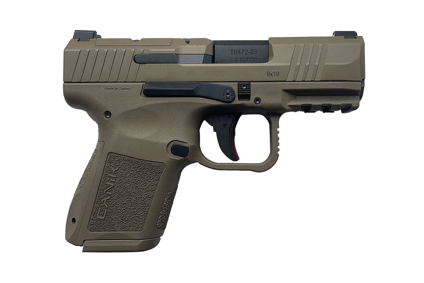 Wyprodukowany przez turecką firmę Canik pistolet MC9 Micro Compact, zasilany amunicją 9 mm, w kolorze FDE.