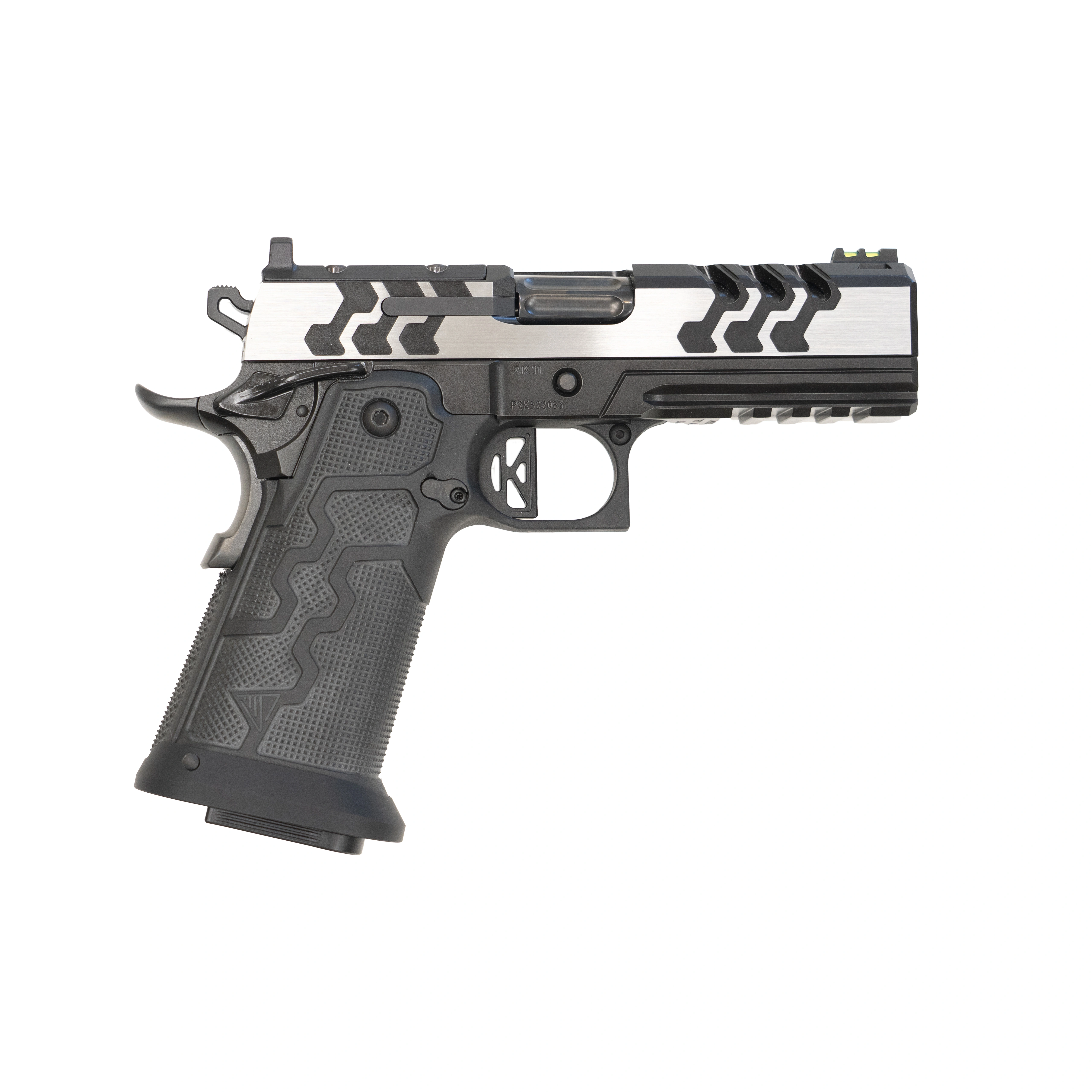 Każdy egzemplarz 2K11 składany jest ręcznie przez jednego rusznikarza, co przekłada się na bardzo wysoką jakość spasowania oraz powtarzalność działania. Krótki, czysty spust GT Match Grade o oporze 3–4 lb pozwala na precyzyjne oddawanie strzałów, a flutowana lufa 4,25” zapewnia stabilność i skuteczne prowadzenie broni przy szybkim ogniu.