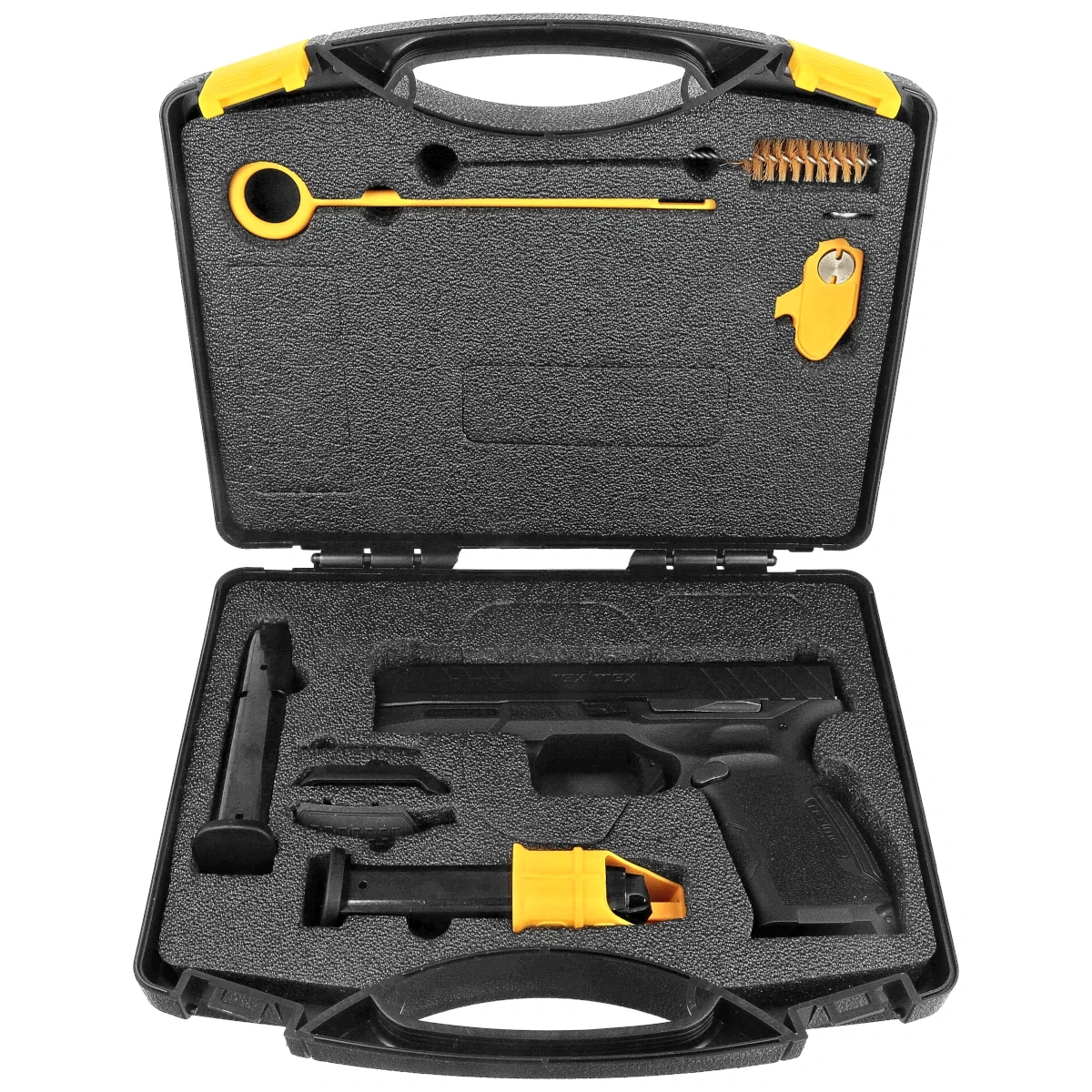 W zestawie znajdziesz dwa magazynki (15-nabojowe), wymienne nakładki na chwyt, lejek Magwell oraz solidną walizkę transportową. Wszystko, co potrzebne, by zacząć korzystać z TRX9 od razu po wyjęciu z opakowania.