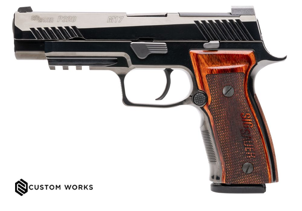 Pistolet P320-M17 Ceremonial opiera się na wysokopołyskowym szkielecie AXG wykonanym w całości z metalu, wyposażonym w rękojeści z orzecha włoskiego od renomowanej firmy Hogue.
