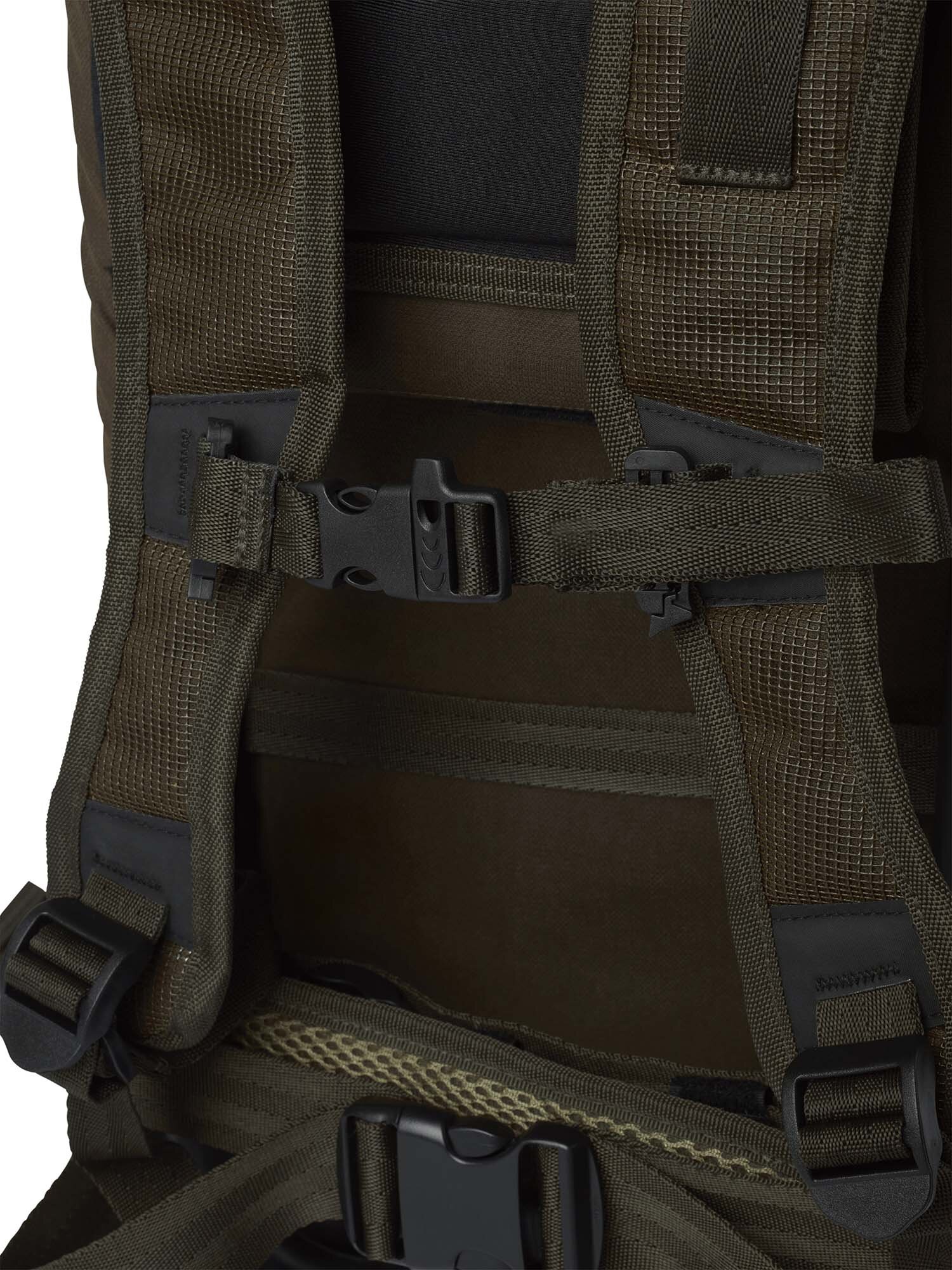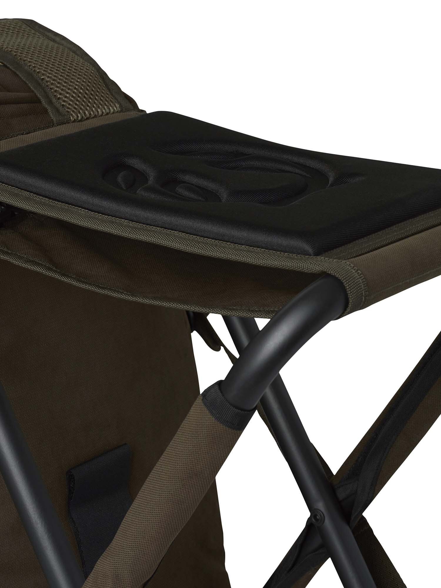Plecak z siedziskiem Chevalier 35L jest wytrzymały i wykonany z mocnego, cichego, wodoodpornego materiału poliestrowego. Poduszka siedziska posiada ocieplenie oraz ozdobne grawerowane logo. Mocna metalowa rama jest osłonięta tkaniną, aby zredukować hałas podczas kontaktu z bronią. Siedzenie działa jak rama nośna, gdy nie jest używane i jest po prostu blokowane za pomocą rzepu. Torba ma dwie kieszenie na butelki na zewnątrz, kieszeń w klapie i pomarańczową kieszeń wewnętrzną z zamkiem błyskawicznym. Regulowane paski na ramię i biodra. Jako dodatkowy szczegół, jeden pasek na ramię ma wbudowany gwizdek. Wysokość siedziska 43,5 cm. Pojemność 35 litrów. Wymiary zewnętrzne: 55x29x46 cm. Waga: 2,2 kg.