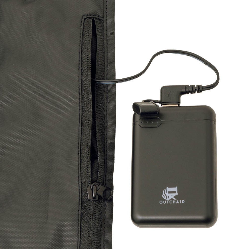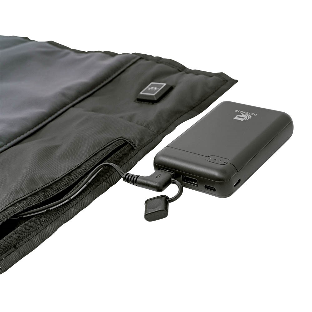 Powerbank bezpiecznie chowa się w bocznej kieszeni, którą można zamknąć zamkiem błyskawicznym. Wymagany power bank jest objęty zakresem dostawy. W zależności od ustawionego poziomu grzania, czas pracy z dostarczonym power bankiem o pojemności 10000 mAh może wynosić do 7 godzin.