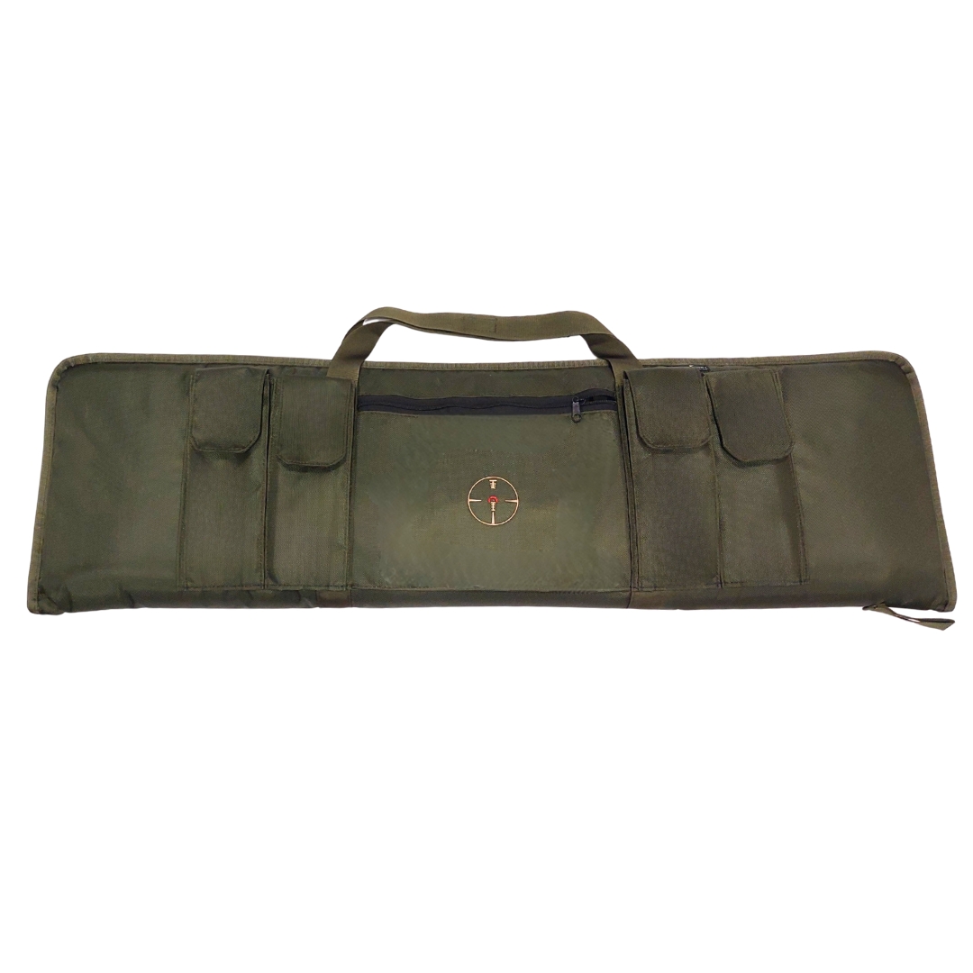 Na froncie znajdują się funkcjonalne kieszenie zapinane na rzepy i zamek – idealne na magazynki, dokumenty, akcesoria czy drobny ekwipunek. Pokrowiec wyposażono również w mocne uchwyty transportowe oraz regulowany pas zabezpieczający, który stabilizuje całość podczas przenoszenia.